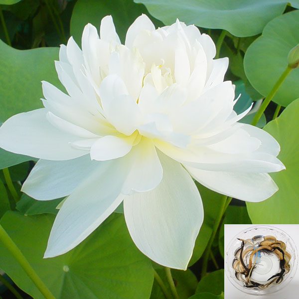 茶碗蓮・チャワンバス・手乗りハス 小型容器でも3輪以上開花するおすすめ品種草花の苗/[26年2月中下旬予約]花はす:レンコン丸:白妙(シロタエ)とてもユニークな、カップ入りの花はすの苗(レンコン)です。大木園芸さんの「手乗りハス」シリーズの苗です。手にのるほどの小さめの容器で栽培できるよう改良した、観賞用の花はすです。ご家庭で水鉢やバケツ・タライなどの底穴の無い容器に土を入れて苗を植え付け、水を張れば栽培できますので、手軽に美しいハスの花を咲かせてお楽しみください。品種:白妙(しろたえ) 白の八重咲き品種。小型容器でも花が上がりやすく丈夫で栽培しやすい品種です。直径30cm×深さ25cm以上の容器での栽培に適しています。花の色が画像と多少異なる場合があります。開花数:直径13.5cm以上の容器で花2輪、直径20cmの容器で花5輪以上(生産者の平均開花数です。栽培環境により異なるため、この数の花つきを保証するものではありません)「手乗りハス」とはハス科ハス属の植物で、食用のレンコンの仲間です。「手乗りハス」は、池や沼、大型のタライでなくては栽培できないと思われていた花ハスを、直径30〜60cmほどの容器で栽培できるように改良・育種した品種です。食用のレンコンや普通の花ハスは小型容器では栽培できません。「手乗りハス」は容器の大きさに合せて葉・花・レンコンが育ちます。大型の容器で栽培すると大きい葉と花を咲かせ花数も増えます。小型の容器で栽培すると可愛い葉となり、花数は減りますが、美しい花が観賞できます。苗(レンコン)は最初の2枚ほどの葉を出す養分を持っていますが、その後は葉が光合成して成長するため、苗の大小にかかわらず、花を咲かせます。タイプ:ハス科の多年草(浮葉植物)植え付け適期:2月下旬〜4月上旬頃まで開花期:6〜8月日照:日なた(冬季休眠中は弱光でもOK)耐寒性:強(目安マイナス5度 地下茎が凍らなければOK)耐暑性:気温・水温とも40度まで順調に生育栽培方法:直径20cm以上、深さ20cm以上の水鉢や底穴のない容器を用意します。赤玉土(小粒)や水生植物用の土、田土、畑土、荒木田土を深さ10cmほど入れ、苗を直接植えます。植え付けの際に芽を折らないよう注意します。水を用土の上10cmになるよう入れて芽が出るのを待ちます。日当たりを好むので、よく日が当たる場所に置きます。植え付け後2週間ほど過ぎてから、初夏までの生育期に2週間に1回程度、発酵済の固形油粕(小指の先大)を7号(直径約21cm)容器では2〜3個程度与えますが、養分が容器に全てとどまるので、やりすぎないよう注意してください。植え付け後しばらくは水位を5センチぐらいと浅めにすると水温が高くなりよく生育しますが、逆に、20〜30センチと深すぎると生育が悪くなります。葉が2枚展開するまでは水深10cmとし、水を切らさないように注意して下さい。葉が生育すれば容器の縁まで雨水がたまっても大丈夫です。水が1cm以下にならないよう注意します。夏から秋にかけて地下茎が肥大化しレンコン(蓮根)ができます。冬場は一度枯れたようになりますが、株が残り越冬します。レンコンが凍らない環境なら戸外で越冬できます。寒冷地は屋内にとりこんでください。株分は 毎年、春(3月頃)に行います。株分けを兼ねて、用土を新しい土に入れ替えてください。写真は成長時(開花時)のイメージですが、お届けの際は苗(レンコン)の状態です。 ■2月中旬〜下旬お届けの予約販売です。・注文締切日:2026年2月9日(月)午前7時・別々のご注文をおまとめすることはできません。送料はそれぞれにかかります。・お届け日は2月10日(火)以降にメールでご案内します。お届け日指定はお受けできませんが、曜日・時間帯指定は承ります。(受信できるアドレスでご注文ください)・品種によりお届け時期の変更や、お届けできなくなる場合があります。[26年2月中下旬予約]花はす:レンコン丸:白妙(シロタエ)の栽培ガイド水生植物大木園芸さんの手乗りハス