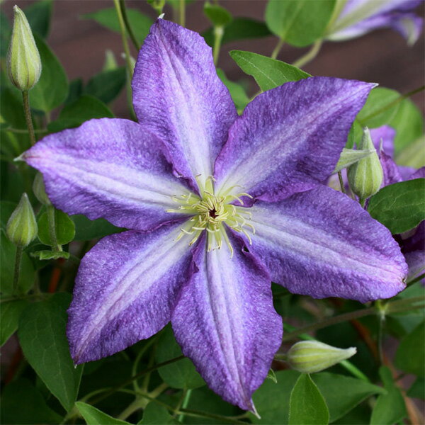2年生苗クレマチスの苗/[26年2月中下旬予約]クレマチス:ホシメグリ(星めぐり)4.5号ポット(フロリダ系)軽くさわやかな青色が筋の淡い色合いと相まって、初夏の雰囲気に良く似合います。すっきりと整った花形で、節々に花を咲かせる多花性のクレマチスです。中国原産の「テッセン」の交配種です。中〜大輪で枝の節々に花をつける多花性品種。開花期間が長く、庭植えのほか鉢植えにも適します。新旧両枝咲きなので剪定も容易です。剪定のタイミングにより次の開花期や花の大きさが変ります。タイプ:キンポウゲ科の耐寒性落葉多年草(つる性)草丈:1.5m〜2.5m花径:6〜9cm開花期:5月〜10月植付け適期:秋、春花のつき方:新枝咲きの遅咲き系(前年の旧枝は株近くまで枯れ、土中または地上部付近に残った枝から新枝10節以上伸ばして開花)剪定:任意(中)剪定 ・花後の剪定:今年伸びた枝の半分をカット。数本枝があるときは、剪定の強弱で開花の時期が多少ずれるので、1つの株で長く楽しむことができる。 ・2月の剪定:冬季充実した枝には花芽が付いているので大きな花を咲かせたいときは枝を整理して、花数を調整してもよい。栽培方法:庭植え、鉢植えで栽培します。苗の根鉢をくずさないようにポットから抜き、地上部の茎の1〜2節が土に埋まるように深植えします。鉢植えの場合は、根が下に伸びますので、5号(直径15cm)以上の深鉢を用い、クレマチス専用培養土をご利用ください。トレリスやフェンスを立て、つるが伸びてきたら誘引して紐等で固定します。施肥により花芽が形成されますので、春から初秋の生育期間に固形肥料を1〜2ヶ月に1回与えます。水遣りは鉢の表面が乾いたらたっぷりと与え、水切れさせないようにします。庭植えの場合も春〜夏は週に一度水遣りしてください。植え替えや剪定は冬季が適期です。大株になってからの植え替えは避けます。剪定方法はクレマチスの系統により異なります。詳しくはクレマチスの栽培方法をご覧ください。4.5号(直径13.5cm)ポット入りです。写真は開花時のイメージですが、お届け時は苗の状態です。<お届けする株について>・株の生育のため、虫食い跡のある葉を切らずにお届けする場合があります。・つるが折れやすい植物です。多少の折れはご容赦ください。脇や株元から新芽が出ます。 芯がつながっていれば枝先は生きているのでテープで補強してください。・冬季は地上部が枯れた状態です。<花色について>クレマチスは、肥料・日当り・温度などにより花色がかなり変化します。適肥・日当り・気温15〜20度の条件下では鮮明な花色が出ます。写真は苗の一例です。お届けは1ポットです。■2月中旬〜下旬お届けの予約販売です。・注文締切日:2026年2月9日(月)午前7時・別々のご注文をおまとめすることはできません。送料はそれぞれにかかります。・お届け日は2月10日(火)以降にメールでご案内します。お届け日指定はお受けできませんが、曜日・時間帯指定は承ります。(受信できるアドレスでご注文ください)・品種によりお届け時期の変更や、お届けできなくなる場合があります。[26年2月中下旬予約]クレマチス:ホシメグリ(星めぐり)4.5号ポット(フロリダ系)の栽培ガイド11月のクレマチスのお手入れ10月のクレマチスのお手入れ9月のクレマチスのお手入れ8月のクレマチスのお手入れ7月のクレマチスのお手入れ12月のクレマチスのお手入れ1月のクレマチスのお手入れ2月のクレマチスのお手入れ3月のクレマチスのお手入れ4月のクレマチスのお手入れ5月のクレマチスのお手入れ6月のクレマチスのお手入れクレマチスの栽培方法クレマチスの冬季お届け形態についてクレマチスの選び方