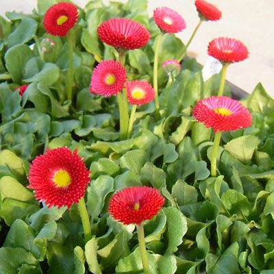 冬の花壇や寄せ植えに草花の苗/デージー:アーリーポンポネットレッド3-3.5号ポット 6株セットアーリーポンポネットは、花茎3cm位の小輪多花性、極早生品種です。葉も小形でまとまりが良く花梗も短く春の高温期にも草姿が乱れずに咲き続けてくれます。デージーは、冬〜春まで楽しめる代表的な植物です。和名は「雛菊」ですが、その長い期間咲き続けること、非常に丈夫で生命力のあることから「長命菊」、「延命菊」、「時不知」などとも呼ばれています。原産地のヨーロッパでは多年草なのですが、日本の環境下では夏越しが難しく一・二年草扱いとなっています。はっきりとした色合いと円形のかわいらしい花は草姿の乱れもなく鉢植えでも花壇植えでも用途は多彩です。タイプキク科ヒナギク属の耐寒性多年草(一・二年草扱い)草丈10〜15cm開花期12〜5月用途花壇、鉢植え、ロックガーデン日照日当り栽培方法:日当たりが良く、やや湿り気のある粘土質の土壌を好みます。移植には強いので花が咲いているときでも植え替えは問題ありません。乾燥には弱いので水やりの頻度に注意してください。植え付け一週間後に緩効性肥料を与えます。以降は葉が黄色っぽくなってきたら肥料切れのサインですのでリン酸が多めの液体肥料を適宜与えてください。ただし、多肥になると軟弱な株となってしまいますので与えすぎには注意してください。写真は成長時(開花時)のイメージです。