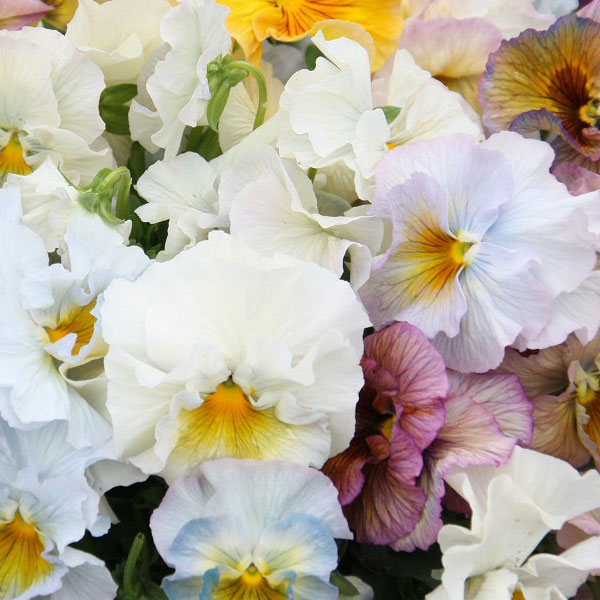 初売りセール ニュアンスカラーのフリル咲草花の苗/見元園芸さんのパンジー:ファランドール3-3.5号ポット* 24株セット高知県の育種家、見元一夫氏のビオラ。やわらかな色あいと可憐な花で大人気です。毎年新しい品種も誕生し、さらに魅力的に。可憐な見元パンジーの世界をお楽しみください。ラベンダー色の人気のフリルパンジーです。色の濃淡がありますが波のような花弁は気品のある華やかさがあり春の演出には欠かせない品種です。花色は色幅があります。個体により気温が低くなってくると色が薄くなってくるものがあります。タイプスミレ科スミレ属の耐寒性1年草開花期10月下旬〜5月株張り15〜20cm草丈15〜25cm花径約3.5〜4.5cm摘芯不要切り戻し不要花がら摘み必要日照半日以上直射日光の当たる屋外植込み株数の目安 鉢プランター:3株/30cm・横長プランター:3株/65cm・花壇:9〜10株/1平方メートル育て方:日照不足になると、葉が黄色くなったり、花付きが悪くなるため、日の当たる場所で管理して下さい。水あげは土の表面が乾いてからたっぷりと与えてください。冬期は夕方以降に水やりをすると、土が凍ってしまうことがあるため、できるだけ午前中に与えて下さい。植え付け後は10日に1回程度、液体肥料を与えてください。長く花を楽しむために、終わった花はこまめに摘み取って下さい。花がらは花茎の根元から指で軽くひねるようにし、花茎ごととり除きます。 写真は成長時(開花時)のイメージです。※花色に色幅があります。※個体により気温が低くなってくると色が薄くなってくるものがあります。。 ※写真はイメージです。見元園芸さんのパンジー:ファランドール3-3.5号ポット* 24株セットの栽培ガイド花がらつみパンジー・ビオラの栽培方法パンジー・ビオラのコンテナガーデン