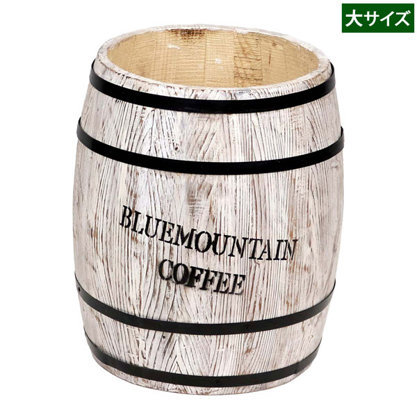 製品仕様(完成品) カラー(型番) ホワイト(CB-3040N-WHT) サイズ(約) 直径35×高さ40cm 重量(約) 2.8kg 材質 天然木(ラッカー塗装) 生産国 中国 ご注意 一点一点ハンドメイドで製造しているため、個体ごとに塗装ムラや形のゆがみ、サイズの誤差等がある場合があります。どこに置いてもおしゃれ!絵になる空間をつくるコーヒーバレル コーヒーバレル 大サイズ 単品 ホワイト 木目を引き立てるホワイト塗装とステンシルロゴが魅力的 コーヒー樽をイメージした、天然木製プランターです。なかなか見かけないヴィンテージライクなデザインと、「こなれた風合い」が、お庭やお部屋を大変身させます。鉢カバーとしてはもちろん、水抜き穴があるので土ごと植物を植えることもできます。天然木の温かさと、ぽってりとした柔らかいフォルムが、植物を引き立てます。屋内で傘立てやごみ箱としてお使いいただいても違和感のない仕上がりです。文字のプリントが、表と裏で上下反対に印字してあるため、どの向きでもお使いいただけます。 直径35cmの大サイズと直径25.5cmの小サイズの2サイズ展開です。