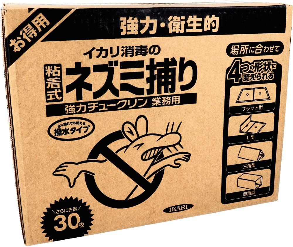 メーカー イカリ消毒 商品カテゴリ 害獣・害虫対策用品>害獣・害虫対策器 発送目安 1〜2週間以内に発送予定 お支払方法 銀行振込・クレジットカード 送料 送料無料 特記事項 その他 ※●強力!衛生的! ●強力粘着剤を使用した捕獲率抜群の業務用ネズミ捕りです。 ●撥水台紙を使用していますので水をはじきます ●縦横の折り目付きで設置場所に応じて形を変えて使用できます ●毒性物質は含まれないので安心してお使いいただけます。 【使用方法】 ・ネズミは壁や物に沿って歩く習性があるので、壁や物に沿って、なるべく数多く設置してください。 ・粘着シートには、エサを置かずに設置してください。 ・新聞紙を敷いた上に設置してください。ネズミの足の汚れが取れ、捕獲しやすくなります。 ・足跡を残して逃げてしまった場合は、設置枚数を増やす、設置場所を変える、新聞紙を敷く等の方法をとり、より捕まえやすくしてください。 【注意】 ・使用前に注意事項をよく読むこと。 ・人が常時歩く場所への設置はなるべく避けること。特に子供がペットがいる場合での使用は十分に注意すること。 ・温度が10〜35℃の範囲で使用すること。 低温や高温での使用は効力が低下する場合があります。 ・火気を避け、なるべく冷所で子供の手が届かない場所に保管すること。 ・粘着剤が衣類、カーテン等につくと取り除くのが困難なので、衣類、カーテン等が触れる恐れのある場所での使用は避けること。 ・捕獲後の粘着シートは折りたたんでネズミをしっかりと挟み込み、早めに「可燃ごみ」として、各市区町村の区分に従って廃棄すること。 ★接着剤がついた場合の処置 ・小麦粉等を粘着にまぶして取り除く事を繰り返し、その後食用油・ベビーオイル・ベンジンを染み込ませてつまみながら落としてください。 (色柄物は色落ちの可能性があります)もしくはクリーニング店に相談してください。 ・ペットや髪の毛、皮膚についた場合:粘力が落ちるまで小麦粉、 ベビーパウダーなどをまぶして取り除き、食用油・ベビーオイルでふき取ることを数回繰り返してください。 原材料・成分