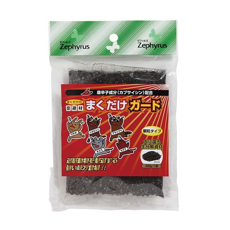 唐辛子成分(カプサイシン)配合! カプサイシンとは、唐辛子を辛くする成分で、動物の目や皮膚の弱いところに付着すると強い刺激と痛みを発生させます。 「辛み」は痛み同様「慣れにくい」感覚と言われ、成分自体は無毒です。 こちらの商品は、顆粒タイプ。 天然ゼオライト(疑灰石)にカプサイシンを配合しています。 種 類:顆粒タイプ 容 量:200g/袋 入 数:20袋類似商品はこちら害獣忌避剤 さすだけガード 10本入り 50袋52,195円害獣忌避剤 置くだけガード 50g×4袋入り 21,908円害獣忌避剤 逃げまんねん! 固形タイプ 16個65,609円害獣忌避石 逃げまんねん! 忌避石 小石タイプ42,386円害獣忌避石 逃げまんねん! 忌避石 小石タイプ33,308円害獣忌避液 逃げまんねん! 液体タイプ 50044,411円害獣忌避用品 ウルフピー 4枚入り 24箱 マ64,591円忌避剤 モグラを寄せつけない 200g 30本25,826円忌避剤 ネズミを寄せつけない 200g 30本25,826円新着商品はこちら2026/1/1610袋 硫酸マグネ 20kg 養液栽培 単肥 25,483円2026/1/1610袋 硝酸石灰4水塩 20kg 養液栽培 単32,819円2026/1/1610袋 塩化カルシウム 25kg 養液栽培 単45,045円再販商品はこちら2026/1/1610巻 シートまもるテープ 白 80mm×209,903円2026/1/16ペレット種子 300粒 ミズナ 京みぞれ 品番580円2026/1/16ペレット種子 100粒 レタス マリア 品番3522円2026/01/17 更新天然素材で安心・強力 忌避剤
