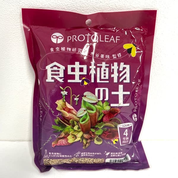 4号鉢向け・食虫植物の植え替えに プロトリーフ食虫植物の土0.6リットル入り 5個セット食虫植物研究家・木谷美咲氏監修の食虫植物専用培養土です。ハエトリソウ、モウセンゴケ、ムシトリスミレ、ウツボカズラ、サラセニアの植え替えにおすすめ。人気が高まりつつある食虫植物ですが、育て方はあまり知られておらず、観葉植物などと同様の育て方をしてしまうと枯らしてしまうリスクが多いです。この土は食虫植物にぴったりな、適度な保水性と排水性があり、弱酸性で肥料の入っていない専用培養土です。食虫植物に合う土を使用することで、枯らすリスクはぐっと抑えられます。水がゆっくり浸透するため、勢いよく与えすぎないようにするのがポイントです。原料 鹿沼土/赤玉土/パーライト/ピートモス/ゼオライト/川砂 等 容量 0.6リットル入り(4号鉢向け)の5個セットです食虫植物の土0.6リットル入り 5個セットの栽培ガイド鉢に入る土の容量と植える苗の数