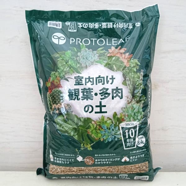 虫がつきにくく臭いも無し・インテリアに! プロトリーフ室内向け観葉・多肉の土8.4リットル入り(10号鉢1鉢分)室内での観葉植物や多肉植物の栽培に適した培養土です。10号(直径30cm)鉢にぴったりの量です。粒状なので手が汚れにくくてお掃除もラクです。濡れると色が変わるので水やりのタイミングがわかりやすく、たい肥を使わないので虫がよりつきにくくなっています。虫がよりつきにくいので虫が苦手な人にぴったりです。2種の元肥入りで育成を効率よくサポートします。原料パーライト、鹿沼土、赤玉土、速効性化成肥料、緩効性化成肥料 等容量8.4リットル入り重量3.83kgサイズ320mm×450mm×55mm 室内向け観葉・多肉の土8.4リットル入り(10号鉢1鉢分)の栽培ガイド鉢に入る土の容量と植える苗の数