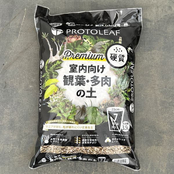 マニアが好む粒が崩れにくい丈夫な土 プロトリーフ硬質PREMIUM室内向け観葉・多肉の土 3.5リットル入り焼成硬質赤玉土と珪藻土を新配合、土の粒が崩れにくいため、植物の根の成長をしっかりサポート。塊根植物(パキポディウム、アデニウムなど)や観葉植物(ホヤ、アグラオネマ、フィカスなど)に最適です。通気性を好むアガベやサボテンなどの大型多肉植物にも使いやすいです。適用植物名観葉植物・多肉植物原料焼成硬質赤玉土、焼成軽石、珪藻土、ゼオライト等容量3.5リットル硬質PREMIUM室内向け観葉・多肉の土 3.5リットル入りの栽培ガイド鉢に入る土の容量と植える苗の数