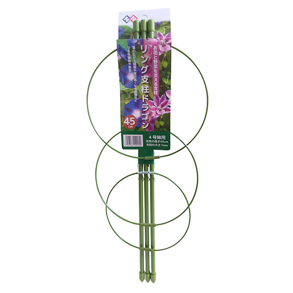 アンドン仕立て用・4号鉢にリング支柱ドラゴン長さ45cm 5本セット つる性植物を形よく育てるアンドン(行灯)支柱です。お手頃価格の商品です。サイズ:高さ45cm、リング直径16〜20cm主材料:PVC被覆鋼管、PVC被覆鉄線※写真はイメージです。