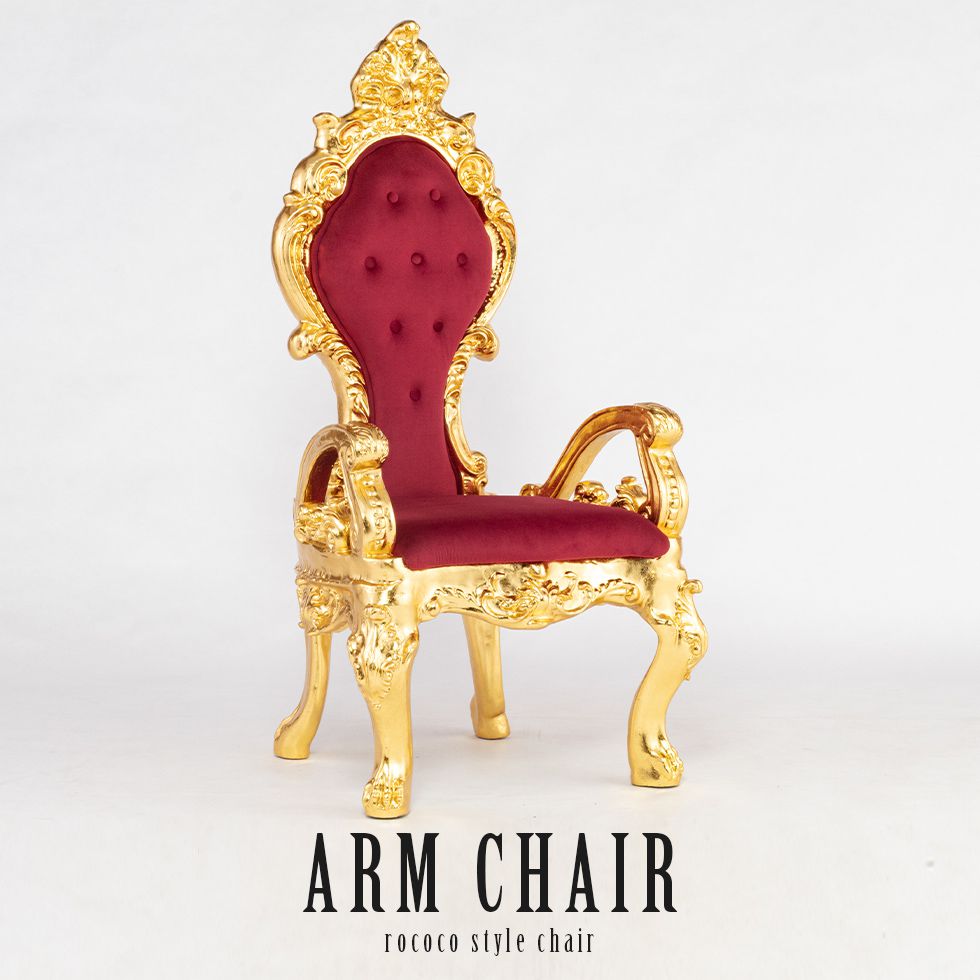 アームチェア 1人掛け ゴールドフレーム×レッド(ファブリック) fp1002-gr ■コメント■ FRP(繊維強化プラスチック)の特性を最大限に活かした豪華なアームチェア 随所に施された装飾が、空間に圧倒的な存在感を与えます 木彫りでは手間とコストがかかる緻密なロココ調の装飾も、 FRPなら細部まで忠実に再現可能です 見た目の重厚さに反して軽量なので、イベント会場や撮影スタジオ内などの移動も比較的スムーズ 衝撃に強く、湿気による腐食や乾燥による割れの心配がほとんどなく、優れた耐久性が魅力です 写真映えする華やかさがあるので、フォトスタジオや結婚式などのフォトブース 美容院、セレクトショップ、ラウンジなどの店舗什器 舞台・撮影小道具などのご使用におすすめです