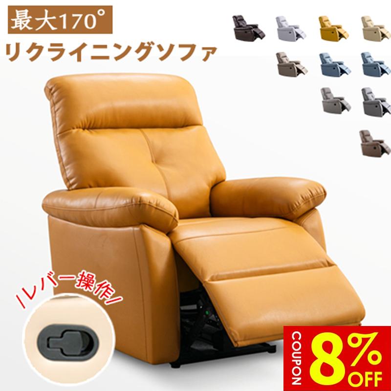 スペック サイズ幅80x奥行88-168x高さ75-100cm(座面高48cm) ※コードの長さ:200cm 素 材[クッション材] 座面・フットレスト:ポケットコイルスプリング・ウレタンフォーム 背面・肘置き:PP綿(ポリプロピレン) [張り材] 合成皮革 エアレザー [構造部材] フレーム:スチールパイプ(クロムメッキ) カラー[合成皮革] アンバーブラウン、グレイホワイト、クリームイエロー、イエローオレンジ [エアレザー] エレガントグレイ、ドウグレイ、マスタードイエロー 、ブルーブラック カーキイロ、モカイロ 重 量約40kg 耐荷重約150kg 梱包サイズ80x77x67cm(約40kg) 特徴 1:レバー一つで簡単リクライニング ソファの右側に付いているレバーを引くとリクライニングができます。背もたれに体重をかけて、最大170°のリクライニングができます。 ※連動式なので、複雑な操作は要りません。 2:余裕の最大170°リクライニング 最大170度までのリクライニング角度が可能です。ゴロンと横になるような角度は、本気で眠ってしまうかもしれません。 3:包み込まれるボリューム感 背もたれ、肘置き、座面など隅から隅までたっぷりとしたクッションで、全身が包み込まれるような感覚で、ゆったりとしたリラックスタイムを過ごせます。 4:たっぷり詰め込まれているPP綿 背もたれ、肘置きのクッションには、弾力性抜群の「PP綿(ポリプロピレン繊維)」が贅沢に詰め込まれています。 また、座面、フットレストには程よい硬さのウレタンをたっぷり使用しています。 5:二種類の張地からお選びいただけます 本革の自然な濃淡やしぼ感までこだわり表現できた合成皮革素材と、耐久性が高く通気性がよくお手入れカンタンなエアレザー素材。 6:工具不要なので付け外しカンタン 結合部には差し込みジョイントが採用されています。ネジを使用していないので付け外しに面倒な工程も工具も必要ないです。
