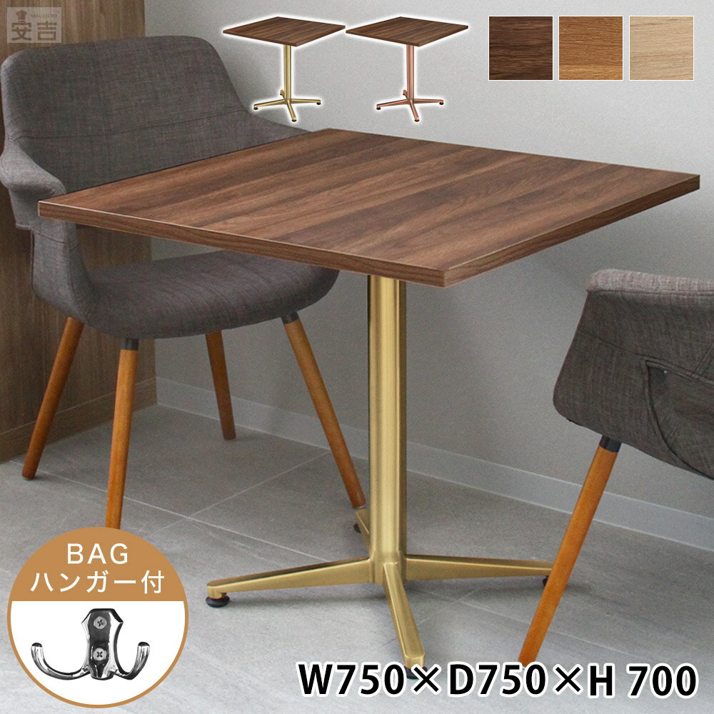 レストランテーブル 【サイズ】750mm×750mm×高さ700mm 【天板の厚み】25mm 【重量】約14.60kg 【天板カラー】ダークウォルナット/ミディアムウォルナット/クリアナチュラル 【脚カラー】ヴィクトリアンゴールド/ローズゴールド 【天板】積層合板/表面・裏面メラミン樹脂化粧繊維板 【脚部】ステンレス バックハンガー付き 【仕様】組立式 ■注意事項 ・直射日光があたる場所は避けて設置してください。 ・ヒーター等、火気の近くには設置しないでください。 ・加熱した鍋や湯沸かし等を直接置かないでください。 ・テーブルに腰掛けたり、踏み台として使用したり天板に立ったりしないでください。 ・湿気の多い場所は避け、平面に設置してご使用ください。 ・床面にキズがつかないよう設置場所にはご注意ください。 ・テーブルに過度な荷重をかけないでください。 ・テーブルの上に物を乗せたまま移動しないでください。 ・移動させる場合には引きずらず、持ち上げた状態で移動させてください。 ・お手入れには薄めた中性洗剤を使用し、その後よく水拭き・乾拭きをしてください。 ・アルコールやベンジン、磨き粉等は使用しないでください。 ・取り付けネジ部は定期的に点検をし、必要であれば増し締めを行ってください。 ・キズや汚れがある場合がございます。予めご了承下さい。 ・配送トラックの都合上、ご注文数量によっては分納となる可能性がございます。 ・椅子はイメージの為付属しません。レストランテーブルのみの販売となります。 カフェやレストランなどの飲食店でご利用頂ける業務用ダイニングテーブル。安吉のレストランテーブルの天板には積層板を採用し確かな強度を実現しました。表面にはメラミン樹脂化粧繊維板で仕上げており傷がつきにくい構造になっています。関連商品