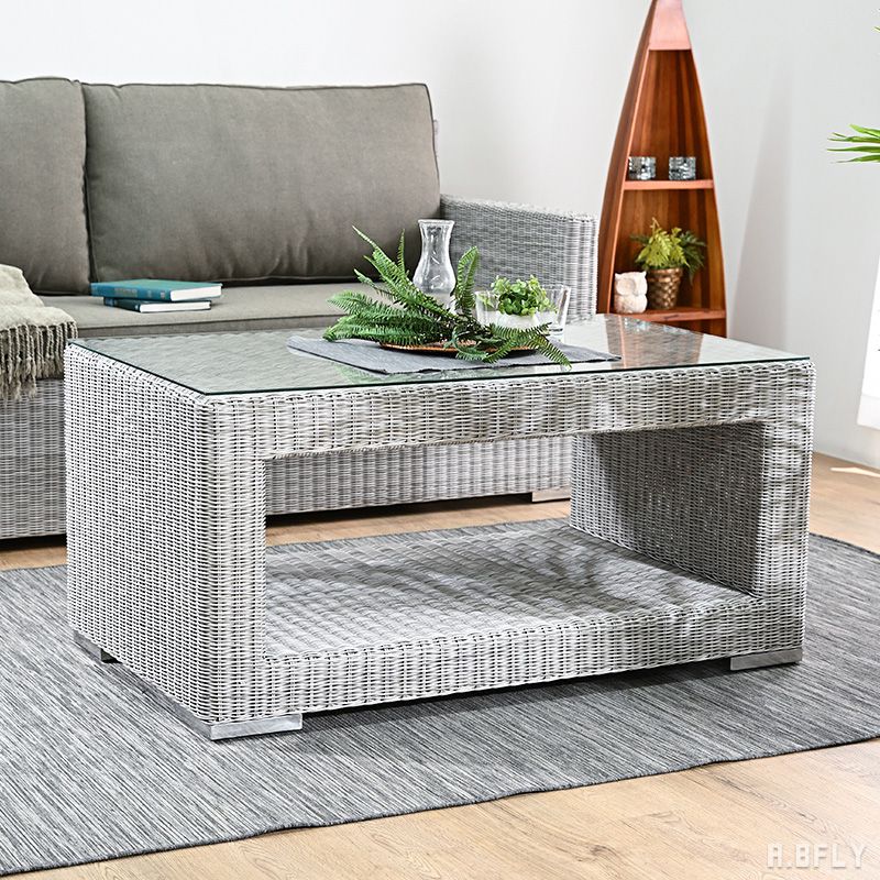素材 人工ラタン(ポリエチレン)、アルミニウム、ガラス サイズ 外寸:(幅)110×(奥行)65×(高)52cm 備考 完成品 注意事項 ※耐候性に優れていますが、雨や紫外線にあたり続けると劣化が早まります。雨ざらしの屋外でのご使用は推奨しておりません。 ※大きさ、重量、色味の様子等には若干の個体差がございます。予めご了承ください。 配送について ●開梱設置便でのお届け(組立不要、時間指定不可) ●納期は10〜14日程度。配送前に配送会社よりお電話で日時を調整いたします。 ●納期は地域や時期によって変動することがあります。 SERIES LINEUP ホワイトウォッシュ ワイルドナチュラル ダークブラウン チャコール グレージュ ホワイトウォッシュ ワイルドナチュラル屋内・屋外で使える、アウトドアテーブル 「天気の良い日に、ベランダやテラスにテーブルを置いて、リゾート地にいる様な気分でゆったりとした休日を過ごしたい。」 こちらの商品は、そんな想いを可能にする屋外での使用も可能なアウトドアテーブルです。 紫外線や風雨に強いポリエチレン素材「シンセティックラタン」で作られています。 耐候性はもちろんのこと、まるで本物のラタンのような見た目のシンセティックラタンのコード。 天然のラタン家具と同様に、ひとつひとつ手作業で作られています。 幅約3mmという細いコードを、テーブルの全面に編み上げるのは、想像絶する仕事量ですが、編み目が狂うことなく均一に編み上げれるのは職人技そのもの。 職人技の光るテーブルで優雅なひと時をお過ごしください。 ※耐候性に優れていますが、雨や紫外線にあたり続けると劣化が早まります。雨ざらしの屋外でのご使用は推奨しておりません。 耐久性、耐候性に優れた「シンセティックラタン」 ラタンに似せて人工的に作った「シンセティックラタン」。 様々な環境に適合することが求められる欧米向けに開発された、強度に優れた高密度ポリエチレンと、柔軟性に富んだ低密度ポリエチレンからなる100%ポリエチレン素材です。 耐久性、耐候性に優れ、紫外線や風雨といった厳しい屋外環境においても品質を保てるので、屋外用の家具として使用するのに非常に適しています。 見た目においても、濃淡のある色合いや、細かな凹凸、表面を撫でた時に少し引っかかりを感じる手触りまで再現された、まるで本物のラタンのような素材です。 そんなシンセティックラタンを使ったテーブルは職人の手編みによって作られています。 編み目の美しさはもちろん、座った時の適度なしなり具合も味わいのひとつ。 また編む量が多く、とても手間のかかった逸品です。 耐久性、耐候性といった特性や、再現度の高い素材感、人の手で作られた温かさなど、魅力がたくさん詰まったテーブルです。 ※耐候性に優れていますが、雨や紫外線にあたり続けると劣化が早まります。雨ざらしの屋外でのご使用は推奨しておりません。 軽くて錆びにくいテーブルフレーム テーブルのフレームには強度があり軽くて扱いやすいアルミニュウムを使用しています。 エポキシコーティングで覆われているので、防錆の効果が非常に高いのが特徴です。 脚部にはステンレスを使用しており、こちらも非常にサビにくいため、屋外家具として最適な素材です。 たっぷりと置けるガラスの天板 ゆったりとした食事の時間を過ごすのにピッタリな、たっぷり置ける幅110cm×奥行65cmの天板サイズ。 シンセティックラタンのコードで出来た本体の上にガラス天板を載せているので、食器を置くのはもちろん、書き物も◎です。 ソファと一緒に使うのにピッタリな高め設計 ソファに座って飲食するのにちょうどいい屋内家具の標準的なコーヒーテーブルよりも高め設計のテーブル。 ソファに座っていても手を伸ばしやすい高さです。 収納便利な天板下スペース 天板下には幅90×奥行き65×高さ30cmの大容量の収納スペースを設けています。 ブランケットや読みかけの本を置いたり、バスケットを置いて、その中に収納したり。 また棚板のないシンプルなつくりなので、あえて何も置かずに、抜け感を楽しむことも。 生活に合わせたスペースの活用ができます。 ストッパー付きでズレにくい天板 テーブル本体とガラス天板をズレにくくするためのストッパーが6ヶついています。 テーブルの編み目にストッパーを差し込み、その上にガラス天板をのせるだけの簡単設置です。 ※耐候性に優れていますが、雨や紫外線にあたり続けると劣化が早まります。雨ざらしの屋外でのご使用は推奨しておりません。 ※大きさ、重量、色味の様子等には若干の個体差がございます。予めご了承ください。