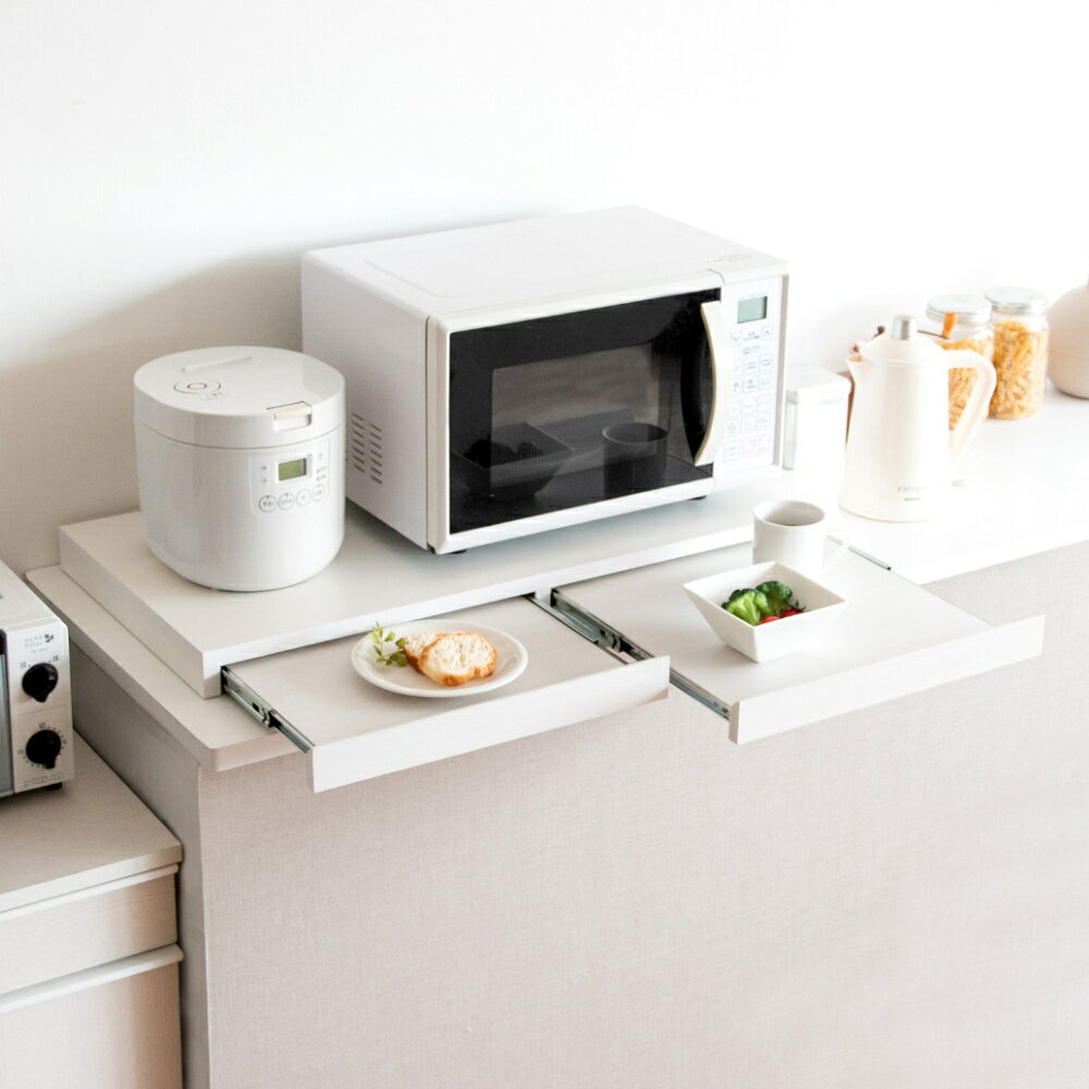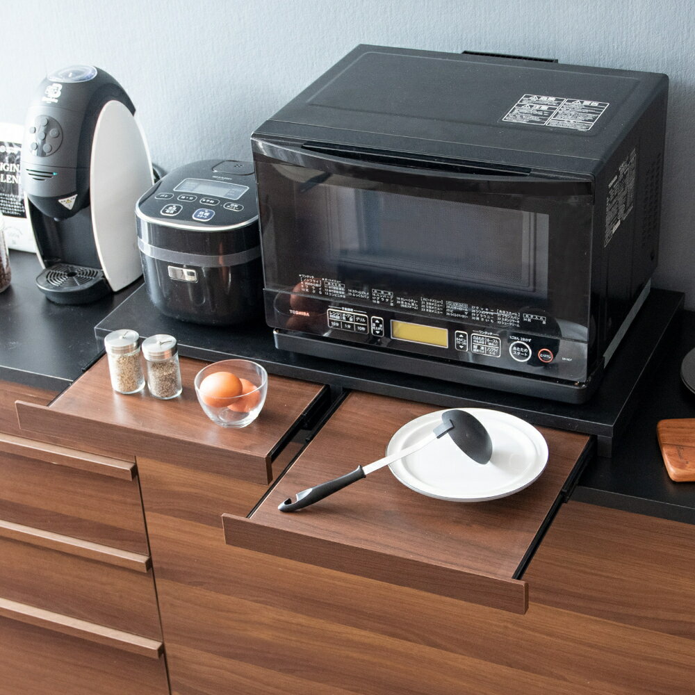 ご購入前に必ずにて商品の詳細をご確認下さい。また、商品に関して何かご不明な点は下記までお問い合せ下さい。株式会社宮武製作所06-6719-0195※メーカーのサポート体制は予告無く変更・終了する場合がございます。※当商品は代金引換をご利用頂く事が出来ません。買い物かごのお支払方法にて代金引換をお選び頂かない様お願い申し上げます。 レンジや家電の下に置くだけで作業スペースが作れるレンジ下トレー『Avenir(アベニール)』二連のトレーにそれぞれ調理器具や料理がサッと置けて家事効率アップ間違いなし。 必要な時だけ引き出せる便利なスライドトレーで、使わないときも邪魔にならず、 手狭なキッチンのお家やワンルームなど、一人暮らしの方にもオススメです。 キッチンをスタイリッシュに演出してくれます。 ■レンジ下に置くだけの簡単設置て作業スペースが増えてお料理が快適 ■お料理の盛り付けやちょい置きなど色々使えるニ連のスライドトレー 二枚並んだスライドトレーは幅34.5×奥行33cm。 ■僅かな力でスムーズに引き出せるフルスライドレール式トレー ◇商品名 レンジ下トレー Avenir(アベニール) ◇サイズ 幅80×奥行き40×高さ5cm ◇材質 合成樹脂化粧板(メラミン) ◇備考 完成品、スライドトレー耐荷重:2kg ※必ず本体天板に10Kg以上の電子レンジ等を上に置いてご使用ください。