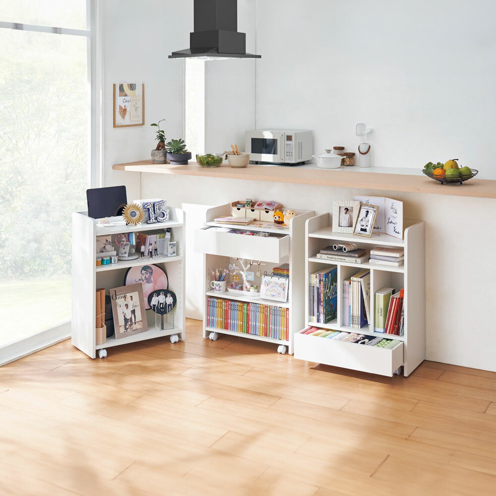 使いたい場所に移動自在。収納したまま動かせる便利なカウンター下収納ワゴンです。背面化粧仕上げで裏返せばすっきり目隠し収納できます。ホワイトと天然木調のおしゃれな色展開も魅力です。在宅勤務、テレワークにも最適。クルッと裏返せばサッと目隠し背面まできれいな化粧仕上げの隠しキャスター付きの収納庫。ワゴン感覚で簡単に移動することができます。小物収納に便利な「小引き出しタイプ」メガネやペン、キッチン周りであればカトラリーなど小物の整理整頓に便利な引き出し付きタイプ。引き出し下はオープンラックになっており、本棚としても。高さは66cm・80cmの2タイプから、幅は59cm・79cmの2タイプからお選びいただけます。カラーはホワイト・ブラウンの2色。カトラリーや食器、食材のストック収納につい増えてしまい収納場所に困るカトラリーやコップ、取り皿の収納や、お菓子や調味料などダイニングテーブルの近くにあれば便利なものの指定席に。天板にも物が置けるため一時的な台としても使えます。テレワーク用の収納としてテレワークをする機会が増えたけど場所がなくダイニングでしているという方にもおすすめ。引き出し付のタイプを使えば文房具など細々したものも収納できます。テレワークが終わればカウンター下に収めるだけ。ダイニングがごちゃつかず片付けも簡単です。推しの収納にも簡単にで目隠しできるため推しのグッズ収納としても。普段はきれいにディスプレイ収納し来客時などはサッと目隠しできます。子どものおもちゃやリビング収納にも大活躍カウンター下以外にも散らかりがちな子供のおもちゃの収納や、リビング収納としても活躍します。上部の角は丸みのある仕上げでお子様のいる家庭でも安心して使用できます。裏返せば見た目スッキリ背面化粧仕上げで、くるっと裏返せばすっきり目隠し収納。生活感も隠せます。外から見えにくい隠しキャスター背面からはキャスターが見えない仕様で、見た目もキレイ(お客さまにてキャスター取付となります)。文房具などの収納に便利な小引き出し小引出しタイプ幅59cmの引出し内寸は、幅52.5高さ8.5奥行24cmです。棚板の高さは調整可能小引き出しタイプワゴンの棚板は、3cm間隔で調整可能です。高さ66cmタイプは3cmピッチ5段階、高さ80cmタイプは3cmピッチ9段階で高さ調整可能。ページ下部に画像の説明がございます。一部別売りの商品もございますので、説明文ご確認のうえご注文ください。>画像の説明はこちら<仕様・サイズ■色:(ア)ホワイト (イ)ブラウン■サイズ:幅59奥行30高さ66cm、引き出し奥行24cm■素材:化粧合板■天板耐荷重・可動棚耐荷重:約5kg■可動棚1枚付き■お客さまにてキャスター取付■日本製■キャスターをご使用の場合、フローリングを傷める恐れがありますのでご注意ください。【組み立て時間約20分】【送料マーク:B】 この商品の配送料は2500円(税込)です。※沖縄県へのお届けは上記に地域特別配送料2200円(税込)が追加されます。この商品は下記のサービスが選択できます。※組み立て・開梱サービスは日時指定ができません。お届け前に配送所より配達日時のご連絡をさせていただきます。※別途配送料金がかかります。有料組み立てサービス※開梱サービス付きについて 画像の説明(イ)ブラウンコーディネート例(イ)ブラウン ※写真は左から棚タイプ・幅79高さ66cm、小引き出しタイプ・幅79高さ66cm、マルチタイプ・幅79高さ66cmです。(ア)ホワイト ※写真は幅59高さ80cmタイプ(ア)ホワイト 背面 ※写真は幅59高さ80cmタイプ(イ)ブラウン 背面 ※写真は幅79cmタイプ※写真はマルチタイプ・幅79高さ80cm外からは見えにくい隠しキャスターだから見た目もキレイ。上部の角は優しい丸みのある仕上げ。文房具などの収納に便利な小引き出し(引出し内寸:幅52.5高さ8.5奥行24cm)高さ66cmの小引き出しタイプの可動棚は3cmピッチ5段階で高さ調整可能。 ※写真は棚タイプ幅79高さ80cmコーディネート例(イ)ブラウン 窓下に置きやすい高さ66cm。壁際に収納が作れてリビングや子供部屋が片付きます。 ※写真は左から小引き出しタイプ・幅79高さ66cm、棚タイプ・幅79高さ66cm、マルチタイプ・幅79高さ66cmです。コーディネート例(ア)ホワイト ※写真は左から小引き出しタイプ・幅59高さ80cm、マルチタイプ・幅59高さ80cm、棚タイプ・幅59高さ80cm、棚タイプ・幅79高さ80cm、小引き出しタイプ・幅79高さ80cm、マルチタイプ・幅79高さ80cmです。コーディネート例(ア)ホワイト カウンター下にフィットする高さ80cm。ワゴンのように動かせるので、ティータイムのお供に。 ※写真は右から棚タイプ・幅79高さ80cm、小引き出しタイプ・幅79高さ80cm、マルチタイプ・幅79高さ80cmです。コーディネート例(イ)ブラウン ※写真は左から棚タイプ・幅79高さ80cm、マルチタイプ・幅79高さ80cm、小引き出しタイプ・幅79高さ80cmです。コーディネート例(イ)ブラウンコーディネート例(ア)ホワイト ※写真は左から棚タイプ・幅59高さ80cm、小引き出しタイ