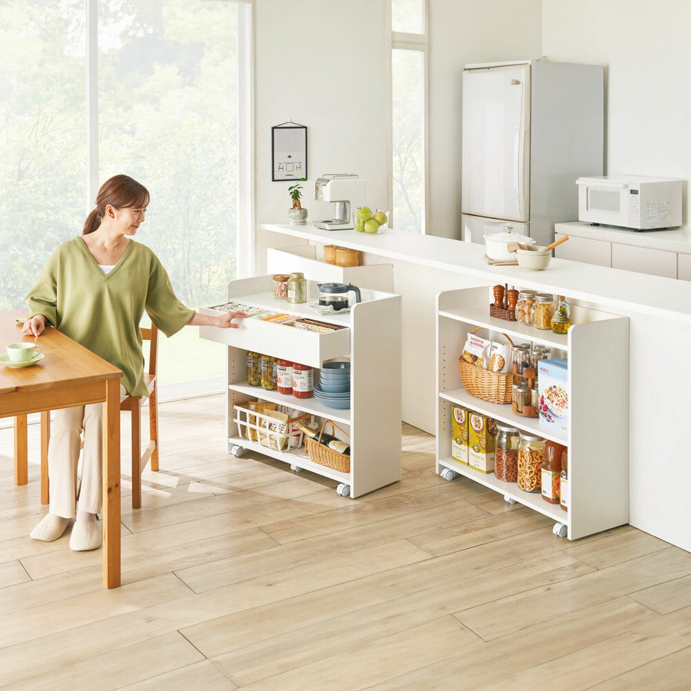 使いたい場所に移動自在。収納したまま動かせる便利なカウンター下収納ワゴンです。背面化粧仕上げで裏返せばすっきり目隠し収納できます。ホワイトと天然木調のおしゃれな色展開も魅力です。在宅勤務、テレワークにも最適。クルッと裏返せばサッと目隠し背面まできれいな化粧仕上げの隠しキャスター付きの収納庫。ワゴン感覚で簡単に移動することができます。小物収納に便利な「小引き出しタイプ」メガネやペン、キッチン周りであればカトラリーなど小物の整理整頓に便利な引き出し付きタイプ。引き出し下はオープンラックになっており、本棚としても。高さは66cm・80cmの2タイプから、幅は59cm・79cmの2タイプからお選びいただけます。カラーはホワイト・ブラウンの2色。カトラリーや食器、食材のストック収納につい増えてしまい収納場所に困るカトラリーやコップ、取り皿の収納や、お菓子や調味料などダイニングテーブルの近くにあれば便利なものの指定席に。天板にも物が置けるため一時的な台としても使えます。テレワーク用の収納としてテレワークをする機会が増えたけど場所がなくダイニングでしているという方にもおすすめ。引き出し付のタイプを使えば文房具など細々したものも収納できます。テレワークが終わればカウンター下に収めるだけ。ダイニングがごちゃつかず片付けも簡単です。推しの収納にも簡単にで目隠しできるため推しのグッズ収納としても。普段はきれいにディスプレイ収納し来客時などはサッと目隠しできます。子どものおもちゃやリビング収納にも大活躍カウンター下以外にも散らかりがちな子供のおもちゃの収納や、リビング収納としても活躍します。上部の角は丸みのある仕上げでお子様のいる家庭でも安心して使用できます。文房具などの収納に便利な小引き出し棚板の高さは調整可能小引き出しタイプワゴンの棚板は、3cm間隔で調整可能です。高さ66cmタイプは3cmピッチ5段階、高さ80cmタイプは3cmピッチ9段階で高さ調整可能。 ページ下部に画像の説明がございます。一部別売りの商品もございますので、説明分ご確認のうえご注文ください。>画像の説明はこちら<画像の説明コーディネート例(ア)ホワイト カウンター下にフィットする高さ80cm。ワゴンのように動かせるので、ティータイムのお供に。 ※写真は右から棚タイプ・幅79高さ80cm、小引き出しタイプ・幅79高さ80cm、マルチタイプ・幅79高さ80cmです。(ア)ホワイト(イ)ブラウン(ア)ホワイト 背面 ※写真は幅59cmタイプ(イ)ブラウン 背面※写真はマルチタイプ・幅79高さ80cm外からは見えにくい隠しキャスターだから見た目もキレイ。上部の角は優しい丸みのある仕上げ。文房具などの収納に便利な小引き出し(引出し内寸幅72高さ8.5奥行24cm)高さ80cmの小引き出しタイプの可動棚は3cmピッチ9段階で高さ調整可能。 ※写真は棚タイプ幅79高さ80cmコーディネート例(イ)ブラウン ※写真は左から棚タイプ・幅79高さ80cm、マルチタイプ・幅79高さ80cm、小引き出しタイプ・幅79高さ80cmです。コーディネート例(イ)ブラウンコーディネート例(ア)ホワイト ※写真は左から棚タイプ・幅59高さ80cm、小引き出しタイプ・幅59高さ80cm、マルチタイプ・幅59高さ80cmです。コーディネート例(ア)ホワイト 裏返せばこのスッキリ感!コーディネート例(イ)ブラウン ※写真は左から棚タイプ・幅79高さ66cm、小引き出しタイプ・幅79高さ66cm、マルチタイプ・幅79高さ66cmです。コーディネート例(イ)ブラウン 窓下に置きやすい高さ66cm。壁際に収納が作れてリビングや子供部屋が片付きます。 ※写真は左から小引き出しタイプ・幅79高さ66cm、棚タイプ・幅79高さ66cm、マルチタイプ・幅79高さ66cmです。コーディネート例(ア)ホワイト ※写真は左から小引き出しタイプ・幅59高さ80cm、マルチタイプ・幅59高さ80cm、棚タイプ・幅59高さ80cm、棚タイプ・幅79高さ80cm、小引き出しタイプ・幅79高さ80cm、マルチタイプ・幅79高さ80cmです。詳細図(単位:cm) ※赤字は内寸 クルッと裏返せばサッと目隠し 背面まできれいな化粧仕上げの隠しキャスター付きの収納庫。ワゴン感覚で簡単に移動することができます。 小引き出しタイプ 幅79高さ80cm(お届け商品)(図の単位cm、赤字は内寸) 小物収納に便利な「小引き出しタイプ」 メガネやペン、キッチン周りであればカトラリーなど小物の整理整頓に便利な引き出し付きタイプ。引き出し下はオープンラックになっており、本棚としても。 高さは66cm・80cmの2タイプから、幅は59cm・79cmの2タイプからお選びいただけます。カラーはホワイト・ブラウンの2色。 使用例(右から棚タイプ幅79高さ80cm、小引き出しタイプ幅79高さ80cm、マルチタイプ幅79高さ80cm) カトラリーや食器、食材のストック収納に つい増えてしまい収納場所に困るカトラリーやコップ、取り皿の収納や、お菓子や調味料などダイニングテーブルの近くにあれば便利なものの指定席に。天板にも物が置けるため一時的な台としても使えます。 使用例(左から棚タイプ幅79高さ66cm
