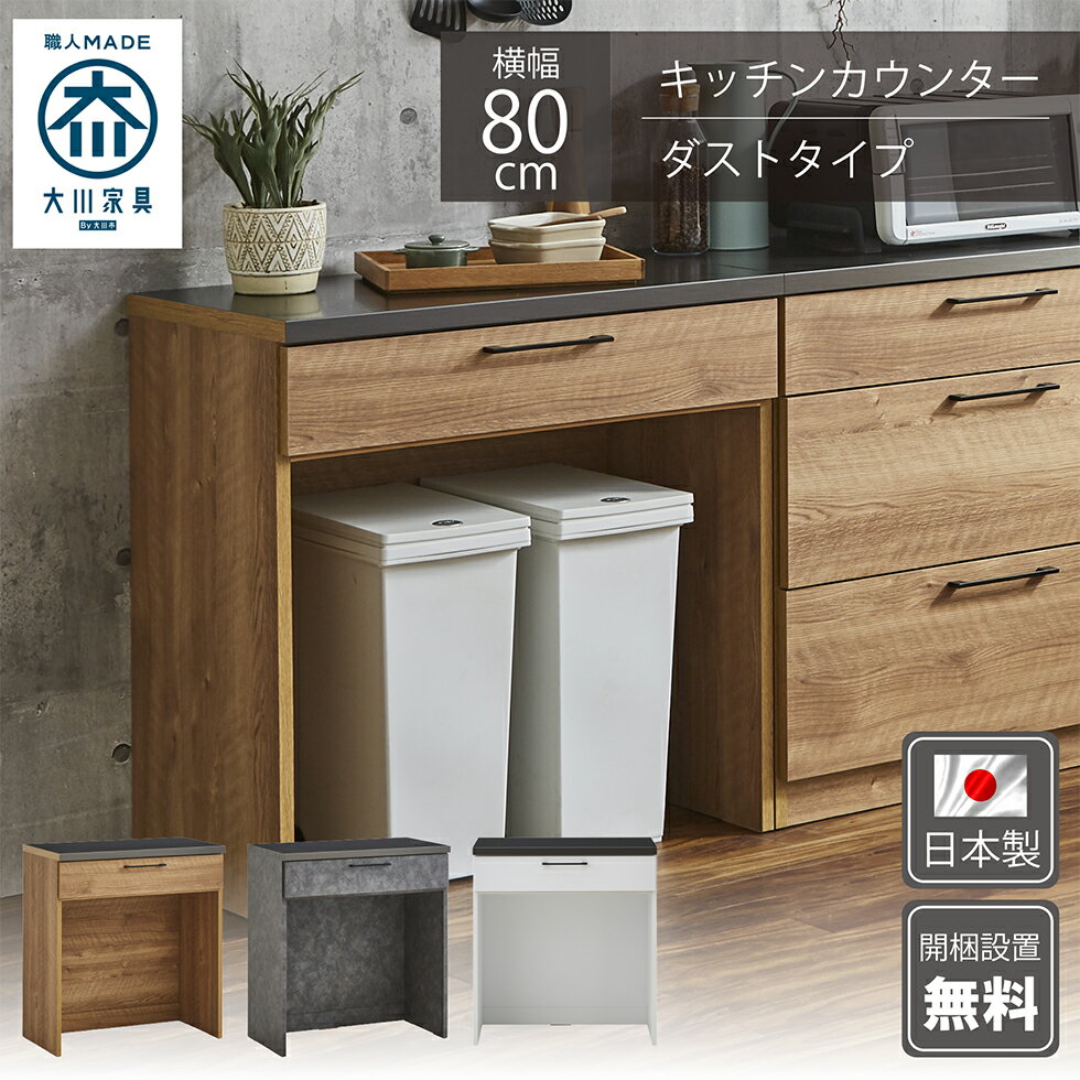 商品説明 本物ような美しい木目と無機質なステンレス風な特殊合板を組み合わせたインダストリアル風なキッチン収納です。 ダストボックスを収納できるダストタイプ。 天板の特殊合板はステンレス同様、耐水性・耐熱性・耐久性に優れ、毎日のお掃除もしやすく、お手入れがとても楽です。 また指紋が付きやすいステンレスとは異なり、指紋が付きにくくなっております。 カウンターの高さは85cmと作業しやすい高さになっています。 背面は化粧仕上げになっているので、キッチンとダイニングの間仕切りとしてもご使用いただけます。 引出しのレールには奥の物までラクに取り出すことができるフルオープンレールを採用。 カラーは木目が映えるナチュラル色、シックで高級感のあるグレー色、清潔感のあるホワイト色の3色からお選びいただけます。 同シリーズの幅80cm引出しタイプと組み合わせれば、幅160cmのカウンターとして、幅120cmのカウンターと組み合わせれば、幅200cmのカウンターとしてもご使用いただけます。 サイズ <商品サイズ> (約)幅79.8X奥行44X高さ85cm <梱包サイズ> (約)幅82X奥行47X高さ87cm カラー ナチュラル グレー ホワイト 素材/材質 表面/側面材:MDF・強化紙 天板:特殊合板 背面:強化紙 取っ手:スチール 特徴 日本製 引出しフルオープンレール 背面化粧仕上げ モイス付き 完成品(取っ手のみ取り付け) 送料 九州〜関東まで【送料無料】 こちらの商品は【玄関渡し】となります。 開梱設置サービスをご利用の場合は別途料金をいただいております。 開梱設置サービス:8,000円 ※配送地域によっては開梱設置便がご利用頂けない場合がございます。 ※東北・北海道・沖縄への配送は別途送料をいただいております。 東北:4,000円 北海道・沖縄本島:6,000円 ※離島へのお届けが必要な場合は別途お見積りとなります。 ※商品1点の金額です。 納期 表示される配送予定日は目安となっております。 同じ都道府県でも配送エリアにより配達日数が異なりますので、表示している最短のお日にちにお届けできない場合もございます。 予めご了承ください。 ご注文商品が欠品の際はメールまたはお電話でご連絡いたします。 配送について ■配送日の前日(または当日の朝)までに配送センターより、おおよその配送時間帯をお電話またはショートメールにてご連絡致します。 配送日当日は必ずご在宅(ご待機)いただけますようお願いいたします。 ■大型商品の場合は事前に搬入経路を必ずご確認ください。 ※搬入できず返品される場合は往復の送料・商品代金の30%をお客様にご負担をいただきます。予めご了承ください。 大型商品は特に物流費が高騰しており、商品代金並みになる場合もございます。十分にご注意ください。 ■商品の吊り上げが必要な場合の費用はお客様ご負担となります。 商品保証 当店の商品には保証書が付属しておりません。商品保証はメーカー保証にて商品到着より1年間となります。 (一部商品を除く) ご理解の程、宜しくお願い申し上げます。 注意事項 ■商品の撮影には最大限注意を払っておりますが、閲覧時のモニター環境によりましては実際の商品と若干違うお色味に映ることもございます。 ■こちらの商品は大型家具の為、ご希望の日時に配送できない場合がございます。予めご了承下さい。■追加料金につきましてはご注文時には反映されず、営業日にご注文を確認後、金額修正させていただきます。 ■お届け予定日の2営業日前の配送日の変更、または当日ご不在の場合は再配送料として8,800円(税込)いただいております。必ず配送日のお知らせメールをご確認ください。 関連商品【マラソン期間10%OFFクーポン配布】【開梱設置付】キッチンカウンタ...【マラソン期間10%OFFクーポン配布】キッチンカウンター 80 ステ...【マラソン期間10%OFFクーポン配布】キッチンカウンター 120 ス...46,500円54,800円67,800円【マラソン期間10%OFFクーポン配布】【開梱設置付】キッチンカウンタ...【マラソン期間10%OFFクーポン配布】【開梱設置付】 キッチンキャビ...【マラソン期間10%OFFクーポン配布】【開梱設置付】キッチンカウンタ...66,400円67,600円69,800円シリーズ商品はこちら