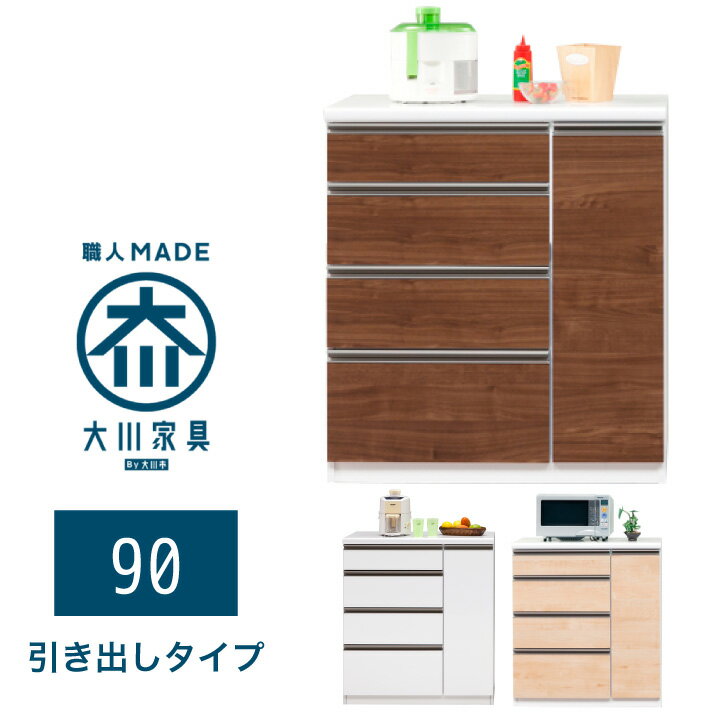 ■ 送料無料にて配達 ■ ■但し、北海道・東北・沖縄・離島を除きます。 北海道・東北・沖縄・離島の方は"■送料について(一部地域は別途送料有り)"プルダウンメニューから対象地域をお選びください。※対象地域でお選びいただけなかった場合でも、送料を加算させていただきます。ご了承ください。 ■運送会社の事情により離島・北海道・他、一部地域においては配達できない場合がございます。■対象地域の送料は別途ご請求とさせていただきます。送料をご承諾されましたら、注文確定メールにて合計金額をお知らせいたします。(注文確定メールが届いていない場合はご質問メールが届いていないか確認お願いします。) ■商品説明(Description of item) 機能性に優れ、シンプルなデザインで高級感を感じられるキッチンカウンター。 清潔感のある艶ありホワイト色、木目ブラックの2色対応です。 材質 MDF ハイグロス サイズ 外寸:幅90×奥行44.5×高さ96cm オープン部:幅55.5×奥行き39.5×30.2cm 引き出し(上)内寸:幅50.5×奥行き36.5×高さ7cm 引き出し(下)内寸:幅50.5×奥行き36.5×高さ18(有効30.5)cm 開き扉部:幅26.5×39.5(棚板29)×高さ83.7cm カラー ホワイト・ブラック木目の2色対応 特徴 完成品 日本製(大川家具) メラミンカウンター 引き出しフルオープンレール オープン部上部モイス付き コンセント2口付き ■画像のカラーについて お持ちのパソコンによって商品の色が実際の商品と異なって見えてしまう場合がございます。 ■納期表記について 当店商品はメーカー取扱商品も販売中の為、稀に在庫切れの場合もございます。 ■商品配送について 配達はすべて玄関渡しとなります。大型商品やエレベーターの無い2F以上のお客様は玄関まで運ぶのをお手伝いをお願いしております。 ■大型商品のお届け日指定について 大型商品は商品出荷からお届けまでに約7〜10日間程お時間を要します。お届け日指定があるお客様は、お時間に余裕をもってご注文くださいますようお願いいたします。沖縄・離島・東北・北海道・郡部等は更にお時間を頂く場合がございます。 ■大型商品のお届け時間について 大型商品の配送は大型専門の運送会社を使用しますので、お届けは18時までのお受け取りに限ります。日付指定をされる際には、日中お受け取りできる日程をご指定ください。 ■お客様都合による出荷後のキャンセルや転送について 家に入らない、カラーや商品を間違えた等のお客様都合のキャンセルの場合は往復分の送料・各手数料・商品代3割をご負担頂きます。住所の間違いによる転送についても転送料をご負担頂きます。 ■商品保証について 不良や破損等が発生した場合お届け日より3ヶ月間保証いたします。保証対象は当店基準により判断させていただきますので、ご要望にお応えいたしかねる場合もございます。