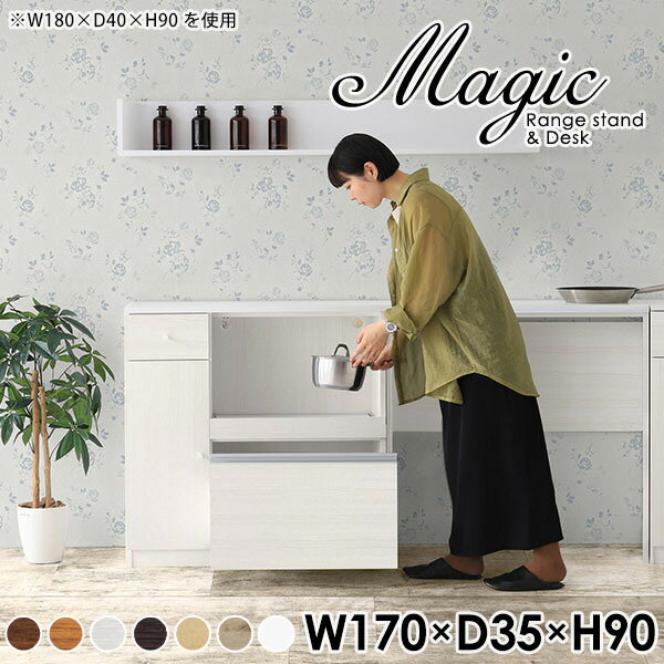 キッチン周りの収納はおまかせ!汚れに強い天板を使用magic レンジ台×作業台 W170×D40×H110 木目サイズサイズ:約幅1700 奥行き400 高さ1100 mm材質[天板・スライド棚]メラミン樹脂化粧合板[前板]ブラウン・ダークブラウン・チーク/デルナチュレ化粧合板ホワイト/ポリエステル化粧合板ナチュラル・ホワイトウッド・オーク/強化紙[側板・内部]プリント化粧合板カラーブラウン/ダークブラウン/ホワイト/北欧チーク/ナチュラル/ホワイトウッド/オークからお選び下さい。※モニターなどの閲覧環境によって、実際の色と異なって見える場合がございます。仕様日本製天板・各ユニット分割式でお客様連結作業あり連結金具付属耐荷重:天板50kg、スライド棚15kg、棚板5kg可動棚板:3枚棚板の厚み:20 mm背面化粧仕上げ(一部タッカー留め)コンセント1口付き(合計1500Wまで使用可能)2箇所ブランド 送料送料無料※北海道・沖縄・離島は送料別途お見積もり。納期ご注文状況により納期に変動がございます。最新の納期情報はカラー選択時にご確認ください。※オーダー商品につき、ご注文のキャンセル・変更につきましてはお届け前でありましても生産手配が済んでいるためキャンセル料(商品代金の50%)を頂戴いたします。※商品到着までの日数は、地域により異なりますご購入時にお届け日の指定がない場合、最短日での出荷手配を行いメールにてご連絡させていただきます。配送・開梱設置について※北海道・沖縄・離島は送料別途お見積もりいたしましてご連絡いたします。【ご注意ください】離島・郡部など一部配送不可地域がございます。配送不可地域の場合は、通常の配送便での玄関渡しとなります。運送業者の便の都合上、地域によってはご希望の日時指定がお受けできない場合がございます。建物の形態(エレベーターの無い3階以上など)によっては別途追加料金を頂戴する場合がございます。吊り上げ作業などが必要な場合につきましても追加料金はお客様ご負担です。サイズの確認不十分などの理由による返品・返金はお受けできません。※ご注文前に商品のサイズと、搬入経路の幅・高さ・戸口サイズなど充分にご確認願います。→ 詳しくはこちら備考【スライド蝶番を使用している扉の調整方法】商品到着時、また長期使用で生じる扉のズレや歪みは、蝶番の調節ネジで扉部分を前後・左右へ移動して調節をお願い致します。※製造上の都合や商品の改良のため、予告なく仕様変更する場合がございますので予めご了承ください。当店オリジナル家具を全部見る同じサイズのデザイン違いはこちら管理番号0000ac007267/0000ac007268/0000ac007269/0000ac007270/0000ac007271/0000ac007272/0000ac007273/メーカー希望小売価格はメーカーカタログに基づいて掲載しています■おすすめラインナップこのページは magic レンジ台×作業台 幅170×奥行40×高さ110cm 木目 のページです。レンジ台には家電製品を置いてもスムーズに出し入れできるスライド棚がついており、1口コンセント付きです。(合計1500Wまで使用可能)引き出しはたっぷり入る深めのタイプで、鍋やフライパンのように嵩張るものもまとめて片づけられます。ダストボックスや箱買いしたストックを収納できる、便利なオープン部分。椅子と合わせて、デスクとしてもご使用いただけます。ツヤのある、高級感を感じさせるメラミン樹脂化粧合板を使用した天板。擦り傷や熱に強く、汚れてもサッと拭き取りやすいのでキッチンの作業スペースやダイニングでの利用におすすめ。『magic(マジック)』はレンジ台と様々な組み合わせを楽しめるシリーズです。サイズ展開も豊富なので、複数を並べることで壁面いっぱいに収納スペースを作ったり、作業台を中心にして広々としたワークスペースにすることも可能です。