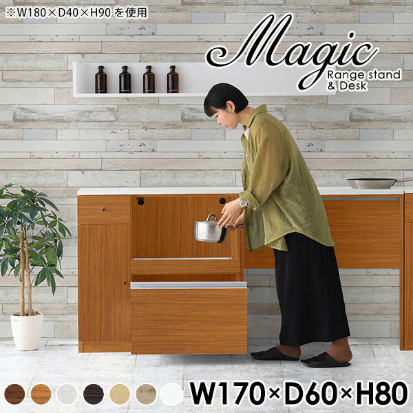 大容量収納!シンプルなキッチンカウンターmagic レンジ台×キャビネット W170×D40×H90 木目サイズサイズ:約幅1700 奥行き400 高さ900 mm材質[天板・スライド棚]メラミン樹脂化粧合板[前板]ブラウン・ダークブラウン・チーク/デルナチュレ化粧合板ホワイト/ポリエステル化粧合板ナチュラル・ホワイトウッド・オーク/強化紙[側板・内部]プリント化粧合板カラーブラウン/ダークブラウン/ホワイト/北欧チーク/ナチュラル/ホワイトウッド/オークからお選び下さい。※モニターなどの閲覧環境によって、実際の色と異なって見える場合がございます。仕様日本製天板・各ユニット分割式でお客様連結作業あり連結金具付属耐荷重:天板50kg、スライド棚15kg、棚板5kg可動棚板:キャビネット用2枚、レンジ台左側収納用2枚棚板の厚み:20 mm背面化粧仕上げ(一部タッカー留め)コンセント1口付き(合計1500Wまで使用可能)1箇所ブランド 送料送料無料※北海道・沖縄・離島は送料別途お見積もり。納期ご注文状況により納期に変動がございます。最新の納期情報はカラー選択時にご確認ください。※オーダー商品につき、ご注文のキャンセル・変更につきましてはお届け前でありましても生産手配が済んでいるためキャンセル料(商品代金の50%)を頂戴いたします。※商品到着までの日数は、地域により異なりますご購入時にお届け日の指定がない場合、最短日での出荷手配を行いメールにてご連絡させていただきます。配送・開梱設置について※北海道・沖縄・離島は送料別途お見積もりいたしましてご連絡いたします。【ご注意ください】離島・郡部など一部配送不可地域がございます。配送不可地域の場合は、通常の配送便での玄関渡しとなります。運送業者の便の都合上、地域によってはご希望の日時指定がお受けできない場合がございます。建物の形態(エレベーターの無い3階以上など)によっては別途追加料金を頂戴する場合がございます。吊り上げ作業などが必要な場合につきましても追加料金はお客様ご負担です。サイズの確認不十分などの理由による返品・返金はお受けできません。※ご注文前に商品のサイズと、搬入経路の幅・高さ・戸口サイズなど充分にご確認願います。→ 詳しくはこちら備考【スライド蝶番を使用している扉の調整方法】商品到着時、また長期使用で生じる扉のズレや歪みは、蝶番の調節ネジで扉部分を前後・左右へ移動して調節をお願い致します。※製造上の都合や商品の改良のため、予告なく仕様変更する場合がございますので予めご了承ください。当店オリジナル家具を全部見る同じサイズのデザイン違いはこちら管理番号0000ac000715/0000ac000716/0000ac000717/0000ac000718/0000ac000719/0000ac000720/0000ac000721/メーカー希望小売価格はメーカーカタログに基づいて掲載しています■おすすめラインナップこのページは magic レンジ台×キャビネット 幅170×奥行40×高さ90cm 木目 のページです。レンジ台には家電製品を置いてもスムーズに出し入れできるスライド棚がついており、1口コンセント付きです。(合計1500Wまで使用可能)引き出しはたっぷり入る深めのタイプで、鍋やフライパンのように嵩張るものもまとめて片づけられます。キャビネットは小物類の収納に便利な引き出し収納と、可動棚で仕舞うアイテムのサイズに合わせた収納ができる扉収納になっています。ツヤのある、高級感を感じさせるメラミン樹脂化粧合板を使用した天板。擦り傷や熱に強く、汚れてもサッと拭き取りやすいのでキッチンの作業スペースやダイニングでの利用におすすめ。『magic(マジック)』はレンジ台と様々な組み合わせを楽しめるシリーズです。サイズ展開も豊富なので、複数を並べることで壁面いっぱいに収納スペースを作ったり、作業台を中心にして広々としたワークスペースにすることも可能です。