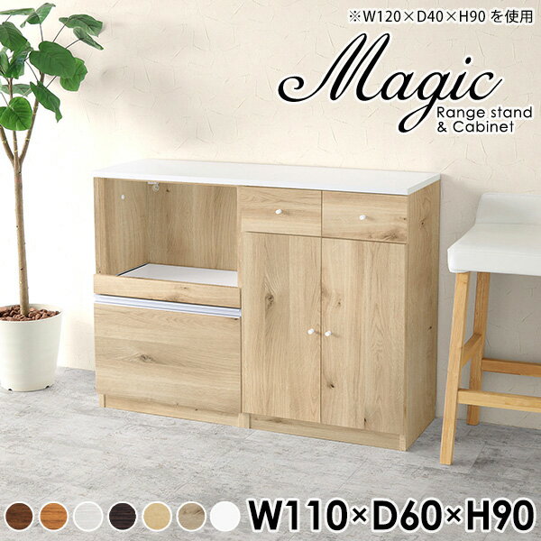 magic レンジ台×キャビネット W110×D60×H90 木目サイズサイズ:約幅1100 奥行き600 高さ900 mm材質[天板・スライド棚]メラミン樹脂化粧合板[前板]ブラウン・ダークブラウン・チーク/デルナチュレ化粧合板ホワイト/ポリエステル化粧合板ナチュラル・ホワイトウッド・オーク/強化紙[側板・内部]プリント化粧合板カラーブラウン/ダークブラウン/ホワイト/北欧チーク/ナチュラル/ホワイトウッド/オークからお選び下さい。※モニターなどの閲覧環境によって、実際の色と異なって見える場合がございます。仕様日本製天板・各ユニット分割式でお客様連結作業あり連結金具付属耐荷重:天板50kg、スライド棚15kg、棚板5kg可動棚板:2枚棚板の厚み:20 mm背面化粧仕上げ(一部タッカー留め)コンセント1口付き(合計1500Wまで使用可能)1箇所ブランド 送料送料無料※北海道・沖縄・離島は送料別途お見積もり。納期ご注文状況により納期に変動がございます。最新の納期情報はカラー選択時にご確認ください。※オーダー商品につき、ご注文のキャンセル・変更につきましてはお届け前でありましても生産手配が済んでいるためキャンセル料(商品代金の50%)を頂戴いたします。※商品到着までの日数は、地域により異なりますご購入時にお届け日の指定がない場合、最短日での出荷手配を行いメールにてご連絡させていただきます。配送・開梱設置について※北海道・沖縄・離島は送料別途お見積もりいたしましてご連絡いたします。【ご注意ください】離島・郡部など一部配送不可地域がございます。配送不可地域の場合は、通常の配送便での玄関渡しとなります。運送業者の便の都合上、地域によってはご希望の日時指定がお受けできない場合がございます。建物の形態(エレベーターの無い3階以上など)によっては別途追加料金を頂戴する場合がございます。吊り上げ作業などが必要な場合につきましても追加料金はお客様ご負担です。サイズの確認不十分などの理由による返品・返金はお受けできません。※ご注文前に商品のサイズと、搬入経路の幅・高さ・戸口サイズなど充分にご確認願います。→ 詳しくはこちら備考【スライド蝶番を使用している扉の調整方法】商品到着時、また長期使用で生じる扉のズレや歪みは、蝶番の調節ネジで扉部分を前後・左右へ移動して調節をお願い致します。※製造上の都合や商品の改良のため、予告なく仕様変更する場合がございますので予めご了承ください。当店オリジナル家具を全部見る管理番号0000ac001037/0000ac001038/0000ac001039/0000ac001040/0000ac001041/0000ac001042/0000ac001043/メーカー希望小売価格はメーカーカタログに基づいて掲載していますこのページは magic レンジ台×キャビネット 幅110×奥行60×高さ90cm 木目 のページです。レンジ台には家電製品を置いてもスムーズに出し入れできるスライド棚がついており、1口コンセント付きです。(合計1500Wまで使用可能)引き出しはたっぷり入る深めのタイプで、鍋やフライパンのように嵩張るものもまとめて片づけられます。キャビネットは小物類の収納に便利な引き出し収納と、可動棚で仕舞うアイテムのサイズに合わせた収納ができる扉収納になっています。ツヤのある、高級感を感じさせるメラミン樹脂化粧合板を使用した天板。擦り傷や熱に強く、汚れてもサッと拭き取りやすいのでキッチンの作業スペースやダイニングでの利用におすすめ。『magic(マジック)』はレンジ台と様々な組み合わせを楽しめるシリーズです。サイズ展開も豊富なので、複数を並べることで壁面いっぱいに収納スペースを作ったり、作業台を中心にして広々としたワークスペースにすることも可能です。