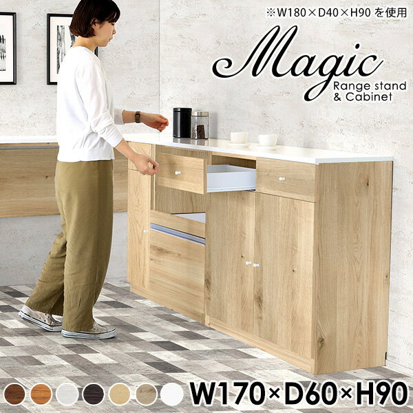 magic レンジ台×キャビネット W170×D60×H90 木目サイズサイズ:約幅1700 奥行き600 高さ900 mm材質[天板・スライド棚]メラミン樹脂化粧合板[前板]ブラウン・ダークブラウン・チーク/デルナチュレ化粧合板ホワイト/ポリエステル化粧合板ナチュラル・ホワイトウッド・オーク/強化紙[側板・内部]プリント化粧合板カラーブラウン/ダークブラウン/ホワイト/北欧チーク/ナチュラル/ホワイトウッド/オークからお選び下さい。※モニターなどの閲覧環境によって、実際の色と異なって見える場合がございます。仕様日本製天板・各ユニット分割式でお客様連結作業あり連結金具付属耐荷重:天板50kg、スライド棚15kg、棚板5kg可動棚板:キャビネット用2枚、レンジ台左側収納用2枚棚板の厚み:20 mm背面化粧仕上げ(一部タッカー留め)コンセント1口付き(合計1500Wまで使用可能)1箇所ブランド 送料送料無料※北海道・沖縄・離島は送料別途お見積もり。納期ご注文状況により納期に変動がございます。最新の納期情報はカラー選択時にご確認ください。※オーダー商品につき、ご注文のキャンセル・変更につきましてはお届け前でありましても生産手配が済んでいるためキャンセル料(商品代金の50%)を頂戴いたします。※商品到着までの日数は、地域により異なりますご購入時にお届け日の指定がない場合、最短日での出荷手配を行いメールにてご連絡させていただきます。配送・開梱設置について※北海道・沖縄・離島は送料別途お見積もりいたしましてご連絡いたします。【ご注意ください】離島・郡部など一部配送不可地域がございます。配送不可地域の場合は、通常の配送便での玄関渡しとなります。運送業者の便の都合上、地域によってはご希望の日時指定がお受けできない場合がございます。建物の形態(エレベーターの無い3階以上など)によっては別途追加料金を頂戴する場合がございます。吊り上げ作業などが必要な場合につきましても追加料金はお客様ご負担です。サイズの確認不十分などの理由による返品・返金はお受けできません。※ご注文前に商品のサイズと、搬入経路の幅・高さ・戸口サイズなど充分にご確認願います。→ 詳しくはこちら備考【スライド蝶番を使用している扉の調整方法】商品到着時、また長期使用で生じる扉のズレや歪みは、蝶番の調節ネジで扉部分を前後・左右へ移動して調節をお願い致します。※製造上の都合や商品の改良のため、予告なく仕様変更する場合がございますので予めご了承ください。当店オリジナル家具を全部見る管理番号0000ac001079/0000ac001080/0000ac001081/0000ac001082/0000ac001083/0000ac001084/0000ac001085/メーカー希望小売価格はメーカーカタログに基づいて掲載していますこのページは magic レンジ台×キャビネット 幅170×奥行60×高さ90cm 木目 のページです。レンジ台には家電製品を置いてもスムーズに出し入れできるスライド棚がついており、1口コンセント付きです。(合計1500Wまで使用可能)引き出しはたっぷり入る深めのタイプで、鍋やフライパンのように嵩張るものもまとめて片づけられます。キャビネットは小物類の収納に便利な引き出し収納と、可動棚で仕舞うアイテムのサイズに合わせた収納ができる扉収納になっています。ツヤのある、高級感を感じさせるメラミン樹脂化粧合板を使用した天板。擦り傷や熱に強く、汚れてもサッと拭き取りやすいのでキッチンの作業スペースやダイニングでの利用におすすめ。『magic(マジック)』はレンジ台と様々な組み合わせを楽しめるシリーズです。サイズ展開も豊富なので、複数を並べることで壁面いっぱいに収納スペースを作ったり、作業台を中心にして広々としたワークスペースにすることも可能です。