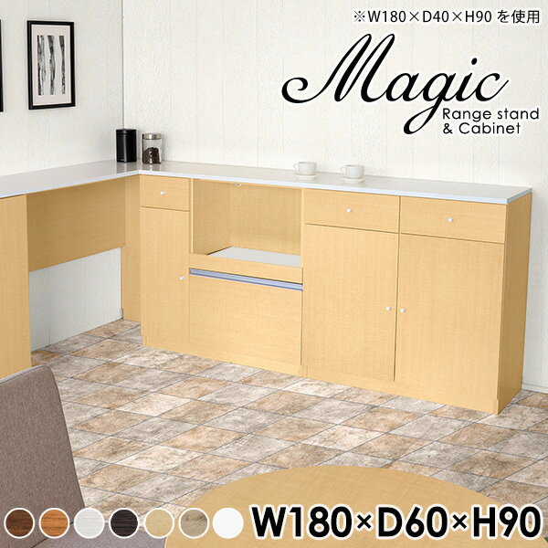大容量収納!シンプルなキッチンカウンターmagic レンジ台×キャビネット W180×D35×H80 木目サイズサイズ:約幅1800 奥行き350 高さ800 mm材質[天板・スライド棚]メラミン樹脂化粧合板[前板]ブラウン・ダークブラウン・チーク/デルナチュレ化粧合板ホワイト/ポリエステル化粧合板ナチュラル・ホワイトウッド・オーク/強化紙[側板・内部]プリント化粧合板カラーブラウン/ダークブラウン/ホワイト/北欧チーク/ナチュラル/ホワイトウッド/オークからお選び下さい。※モニターなどの閲覧環境によって、実際の色と異なって見える場合がございます。仕様日本製天板・各ユニット分割式でお客様連結作業あり連結金具付属耐荷重:天板50kg、スライド棚15kg、棚板5kg可動棚板:キャビネット用2枚、レンジ台左側収納用2枚棚板の厚み:20 mm背面化粧仕上げ(一部タッカー留め)コンセント1口付き(合計1500Wまで使用可能)1箇所ブランド 送料送料無料※北海道・沖縄・離島は送料別途お見積もり。納期ご注文状況により納期に変動がございます。最新の納期情報はカラー選択時にご確認ください。※オーダー商品につき、ご注文のキャンセル・変更につきましてはお届け前でありましても生産手配が済んでいるためキャンセル料(商品代金の50%)を頂戴いたします。※商品到着までの日数は、地域により異なりますご購入時にお届け日の指定がない場合、最短日での出荷手配を行いメールにてご連絡させていただきます。配送・開梱設置について※北海道・沖縄・離島は送料別途お見積もりいたしましてご連絡いたします。【ご注意ください】離島・郡部など一部配送不可地域がございます。配送不可地域の場合は、通常の配送便での玄関渡しとなります。運送業者の便の都合上、地域によってはご希望の日時指定がお受けできない場合がございます。建物の形態(エレベーターの無い3階以上など)によっては別途追加料金を頂戴する場合がございます。吊り上げ作業などが必要な場合につきましても追加料金はお客様ご負担です。サイズの確認不十分などの理由による返品・返金はお受けできません。※ご注文前に商品のサイズと、搬入経路の幅・高さ・戸口サイズなど充分にご確認願います。→ 詳しくはこちら備考【スライド蝶番を使用している扉の調整方法】商品到着時、また長期使用で生じる扉のズレや歪みは、蝶番の調節ネジで扉部分を前後・左右へ移動して調節をお願い致します。※製造上の都合や商品の改良のため、予告なく仕様変更する場合がございますので予めご了承ください。当店オリジナル家具を全部見る同じサイズのデザイン違いはこちら管理番号0000ac000085/0000ac000086/0000ac000087/0000ac000088/0000ac000089/0000ac000090/0000ac000091/メーカー希望小売価格はメーカーカタログに基づいて掲載しています■おすすめラインナップこのページは magic レンジ台×キャビネット 幅180×奥行35×高さ80cm 木目 のページです。レンジ台には家電製品を置いてもスムーズに出し入れできるスライド棚がついており、1口コンセント付きです。(合計1500Wまで使用可能)引き出しはたっぷり入る深めのタイプで、鍋やフライパンのように嵩張るものもまとめて片づけられます。キャビネットは小物類の収納に便利な引き出し収納と、可動棚で仕舞うアイテムのサイズに合わせた収納ができる扉収納になっています。ツヤのある、高級感を感じさせるメラミン樹脂化粧合板を使用した天板。擦り傷や熱に強く、汚れてもサッと拭き取りやすいのでキッチンの作業スペースやダイニングでの利用におすすめ。『magic(マジック)』はレンジ台と様々な組み合わせを楽しめるシリーズです。サイズ展開も豊富なので、複数を並べることで壁面いっぱいに収納スペースを作ったり、作業台を中心にして広々としたワークスペースにすることも可能です。