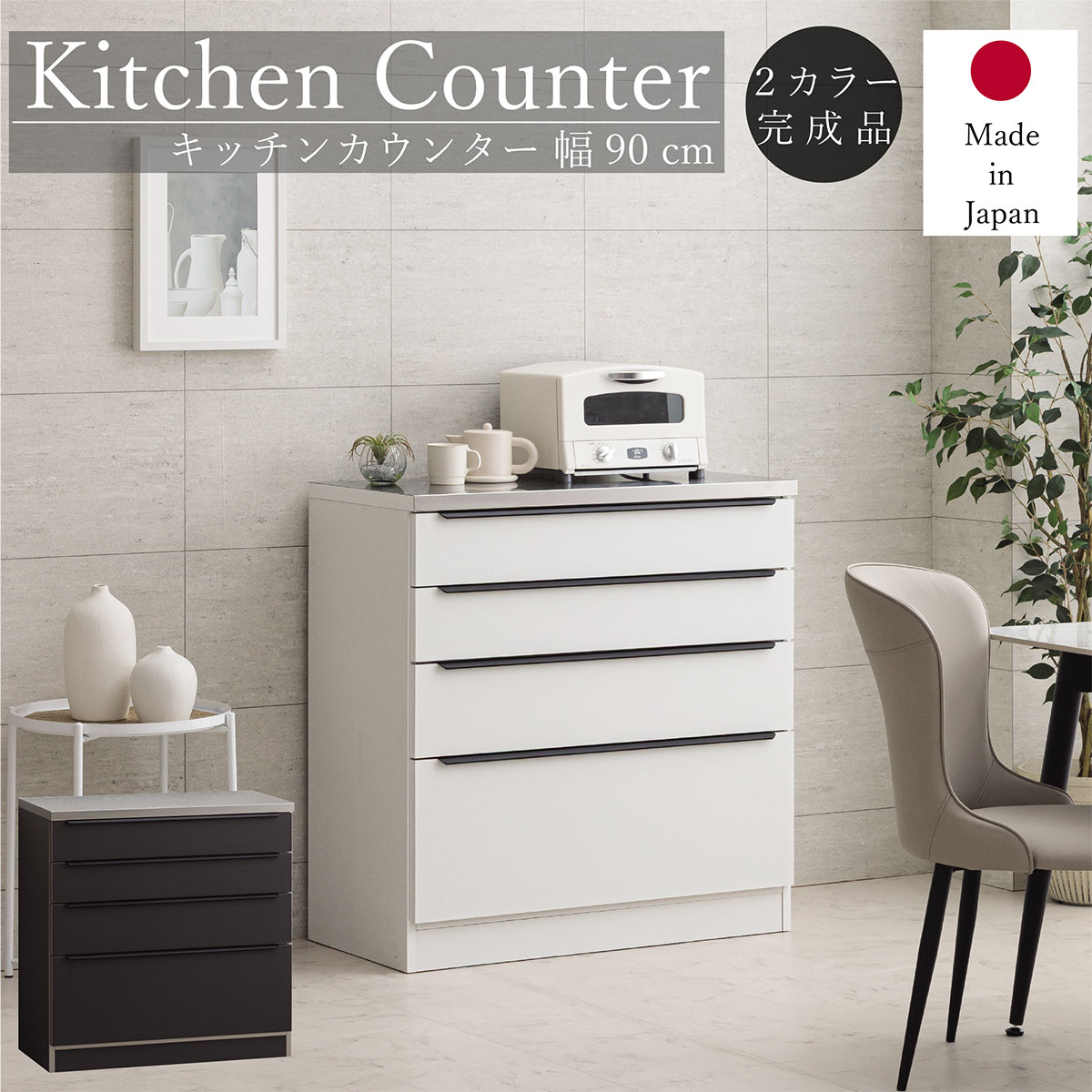 組立設置コンセント有りフルスライドスライドテーブルPOINT女性が作業するのにちょうどいい高さのキッチンカウンター「ノア」。天板には炊飯器や電気ケトルなどの家電製品が使える2口コンセント付き。その他のサイズサイズ価格幅90cm【選択中】¥49,990幅120cm¥59,990幅160cm¥69,990配送方法関連カテゴリへ→トップページへ→代表SKU4300234サイズ幅90×奥行48.3×高さ85.3(cm)カラー2色天板ホワイト:ハイグロスシート、グレー:オレフィンシート前板ホワイト:ハイグロスシート、グレー:強化紙構造部材MDF引出仕様裏側に補強桟引出レール仕様(最下段)フルオープンレール、補助キャスター引出レール仕様(最下段以外)ソフトクローズレール天板耐荷重約50Kg全段耐荷重約10Kgコンセント天板右に2口、下台OP部に1口(1500wまで)梱包サイズ約93x50x86(cm)梱包重量約52kg原産国ベトナムオーブンレンジやコーヒーメーカーなどが置きやすいオープンスペース。ホワイト天板には美しい光沢があり、耐久性の高いハイグロスシートを採用。キズや汚れに強くお手入れも簡単。セラミックグレー天板には質感があるマットな仕上がりのオレフィンシートを使用。天板には炊飯器や電気ケトルなどの家電製品が使える2口コンセント付き。引き出しは、奥の物を取り出しやすいフルオープンスライドレール付き。上段・中段はソフトクローズレール仕様。耐久性も高くより、スムーズに開閉します。下段2杯の引き出しには開閉しやすく、耐久性の向上にもなる補助キャスター付き。高級感のあるシルバーのアルミ取っ手を採用。無駄のないスタイリッシュなデザイン。引き出しの全段裏側には、底板のタワミや抜け防止の補強板を付け、裏側からしっかり支える耐久性。なめらかに開閉ができる、金属製のフルスライドレールを採用。炊飯器などの家電を置くのに便利。側面も背面も化粧仕上げ。