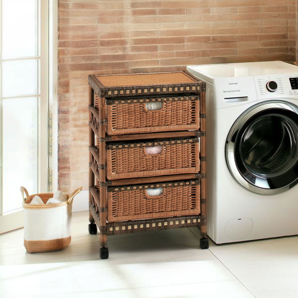 商品説明 サイズ(cm) W70×D36×H92 内寸:W30×D29×H15 内寸小:W21×D29×H15 仕様 フレーム:籐/合板 引出し:籐/天然木 内張 キャスター付 組立品 内布取り外し可能 ◆通気性が良いラタン製バスケットを組み合わせたランドリー。 ◆片側天板は上から開閉でき、よく使うタオルやハンカチなどを片手でも楽に出し入れすることができます。 ◆内布付きなので衣類をひっかかりなく収納できます。 ◆ラタン製で軽く、キャスター付きで、さっと移動できます。 ※自然素材を使用しハンドメイドで仕上げています。大きさ、色味、質感には若干の個体差がございます。予めご了承ください。 送料 送料無料ただし、北海道、沖縄、離島は追加料金がかかります。お気軽にお問合せ下さい。