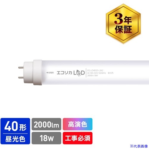 オレンジブック トラスコ中山 TRUSCOecorica 直結専用 直管形LEDランプ 高出力40形 昼光色(6500K)タイプ 〔品番:ECLLD40FAD〕[ 注番:5483967]特長●天井の高い工場や倉庫向けに最適な高出力直管形LEDです。●自然光により近い平均演色評価数Ra80以上で美しい色味を再現します。●既存照明と比較して60%以上の削減●配光角200°の実現により、より広範囲に灯りを照らします。用途●高天井、照度が必要な建物に最適仕様●明るさ(lm):2800●光源色:昼光色相当●管長(mm):1198●消費電力(W)100V:17.5●消費電力(W)200V:17.5●演色性:80●定格寿命(時間):50000●定格電圧(V):AC100V/200V●口金:G13仕様2●電源内蔵 片側給電仕様(直結工事が必要です)●最大発光効率160lm/wの高出力タイプ●ノイズ対策 CISPR 15 / VCCI Class B●安心の3年保証材質/仕上●ケース材質:ポリカーボネート●放熱板材質:アルミニウムセット内容/付属品注意●本製品を設置するには器具内部の配線を変更して安定器を介さずに電源を直接LEDに配線する直結工事が必要です。●調光器具には対応しておりません。原産国(名称)韓国JANコード4562451405576本体質量440gオレンジブック トラスコ中山 TRUSCOecorica 直結専用 直管形LEDランプ 高出力40形 昼光色(6500K)タイプ 〔品番:ECLLD40FAD〕[注番:5483967][本体質量:440g]《包装時基本サイズ:1258×36×37》〔包装時質量:540g〕分類》工事・照明用品》作業灯・照明用品》直管形ランプ☆納期情報:仕入れ先通常在庫品 (欠品の場合有り)