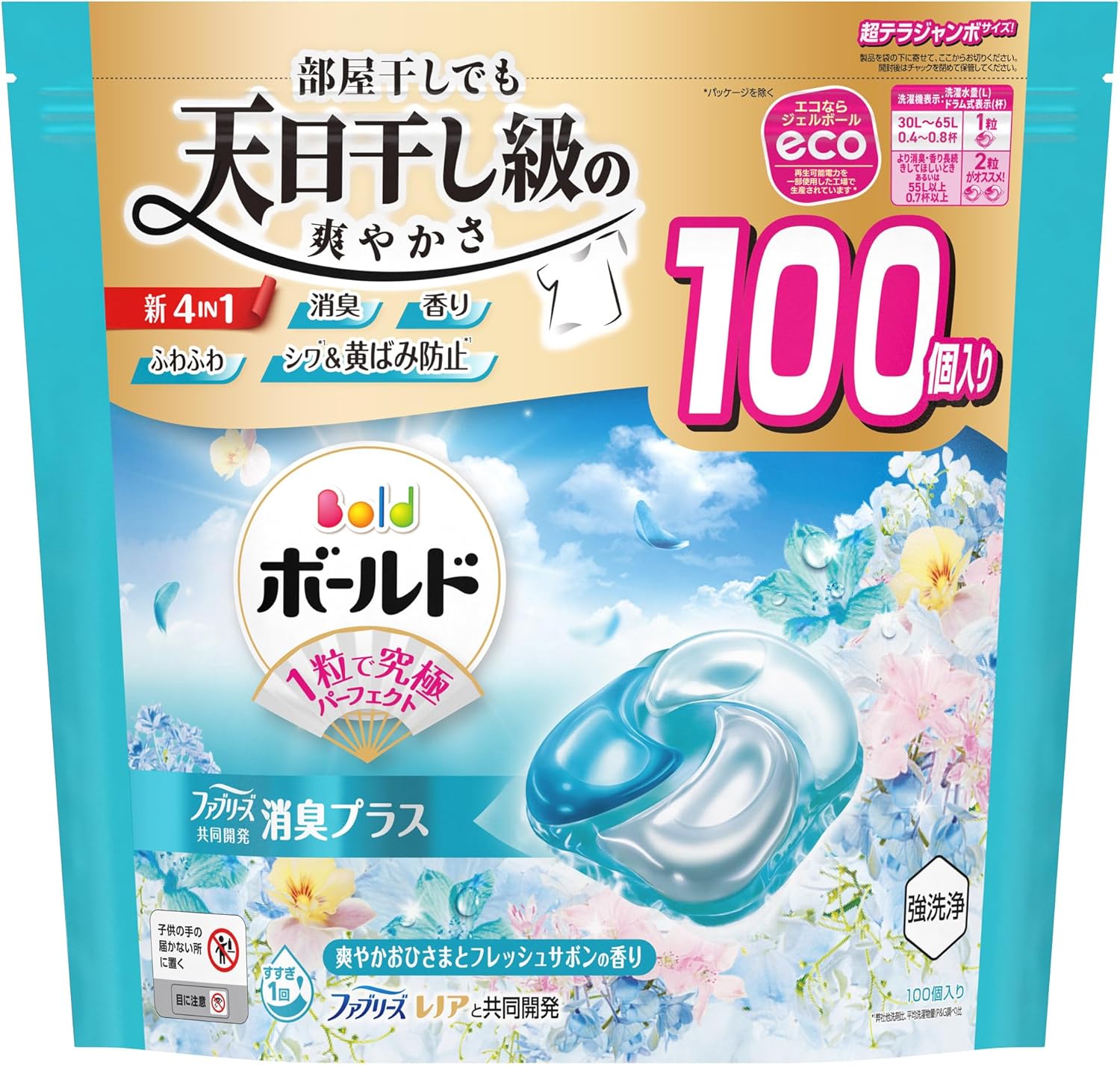ボールド 洗濯洗剤 ジェルボール 4in1 爽やかおひさまとフレッシュサボンの香り 詰め替え 100個 ボールドジェルボールは4つの柔軟剤成分が1粒に配合 消臭・ふわふわ・香り・シワ&黄ばみ防止爽やかフレッシュフラワーサボンの香り強洗浄ですすぎ1回でOK 5