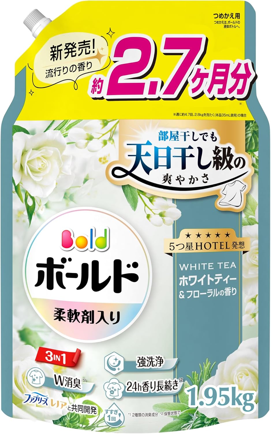 Bold ボールド 柔軟剤入り 洗濯洗剤 液体【ホワイトティー&フローラルの香り】 詰替え 1950g 3IN1で強洗浄+W消臭+24h香り長続き心弾けるホワイトティー&フローラルの香り部屋干しにもOKファブリーズ&レノアと共同開発強洗浄ですすぎ1回でOK 5