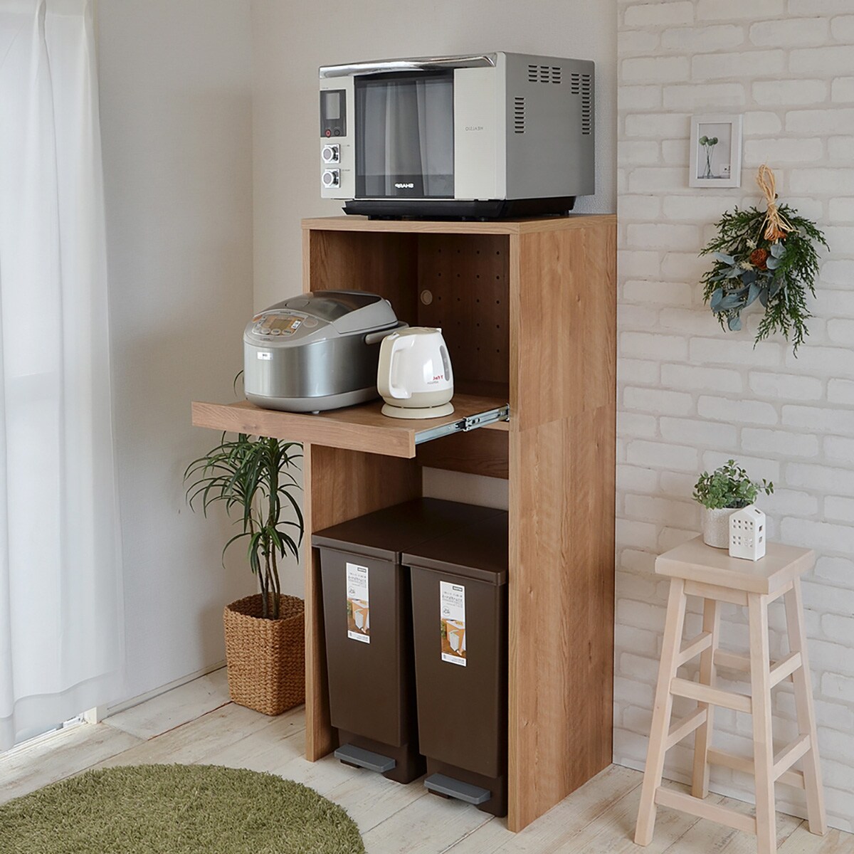 ■電子レンジ、電器ケトル、炊飯器まで纏めて収納!■炊飯器の蒸気をしっかり逃がせるフルスライドレールを採用。■背板にはコンセント通し穴があります。■天板耐荷重:25kg■スライド棚耐荷重:10kg【詳細サイズ(約)】ごみ箱収納部分の内寸:幅56×奥行42.8×高さ85cm※画像のごみ箱は、幅26.5×奥行45.5×高さ55.5cmを2台使用しています。画像で使用しているごみ箱はこちら※こちらはメーカー直送商品です。色:ライトブラウン主な素材:繊維板サイズ(約):幅60.6×奥行46.4×高さ128.1cm保証年数:1年重量:約16kg組立時間目安:30分納品方法:玄関先迄納品日時指定について