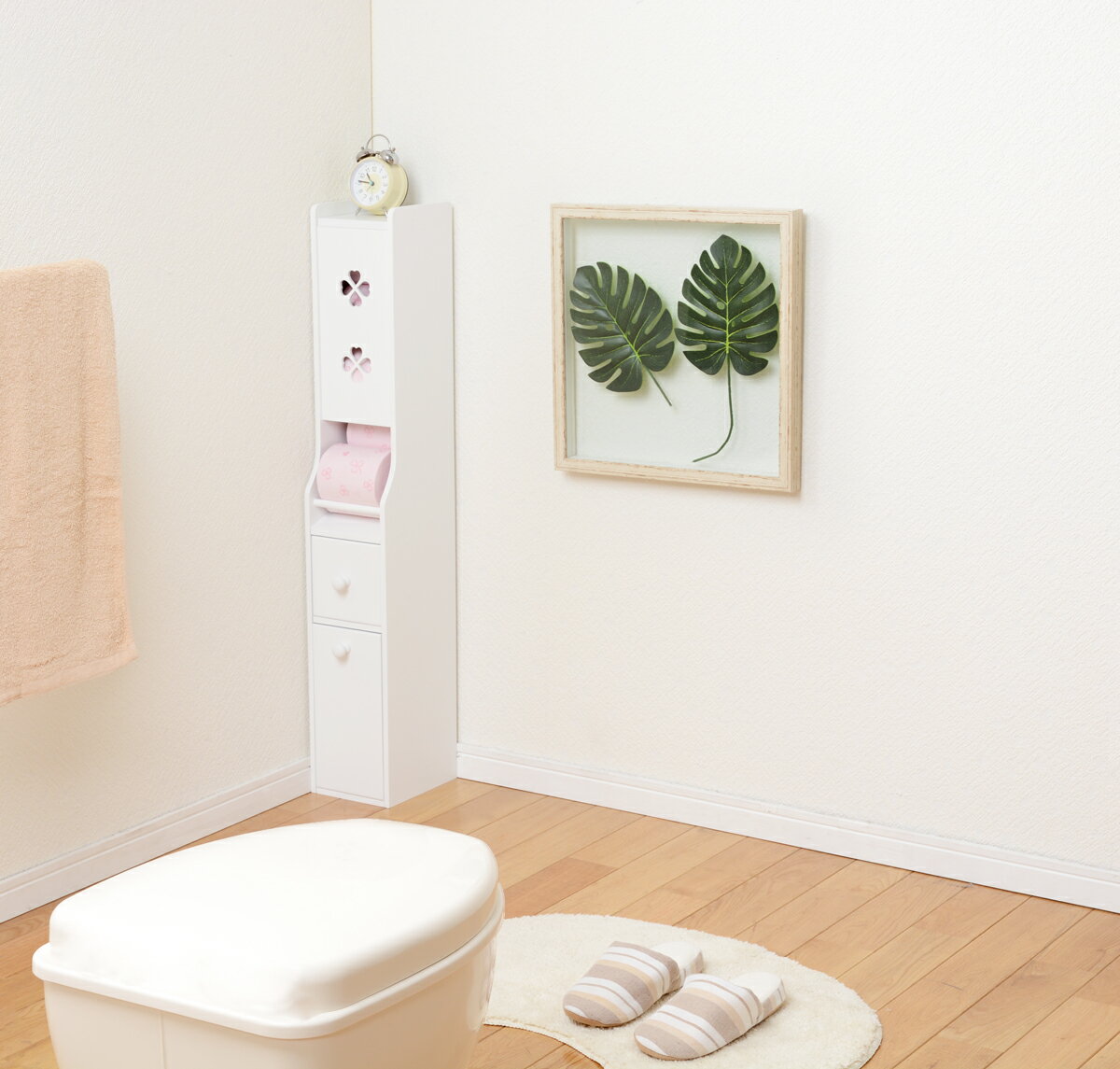 ご購入前に必ずにて商品の詳細をご確認下さい。また、商品に関して何かご不明な点は下記までお問い合せ下さい。萩原株式会社 スリーアイ本部086-523-4560※メーカーのサポート体制は予告無く変更・終了する場合がございます。※当商品は代金引換をご利用頂く事が出来ません。買い物かごのお支払方法にて代金引換をお選び頂かない様お願い申し上げます。 ■省スペースでもペーパーロールやお掃除ブラシなどを清潔スッキリ収納。 ■コーナーに設置できる小スペースタイプ。限られた空間を有効活用できます。 ■クローバーの型抜きで残りが見えるトイレットペーパー収納。 ■下段を開けるとダストボックス。ボックスは取り出せるのでゴミ捨てもらくらく。 ◇サイズ:(約)幅15.5×奥行19×高さ93cm ◇素材 主材:MDF ◇内寸 ・引出内寸:(約)幅12×奥行17×深さ12cm ・ゴミ箱内寸:(約)幅10×奥行11×深さ18cm ◇ほぼ完成品(ドライバーで取っ手の取り付けが必要です)