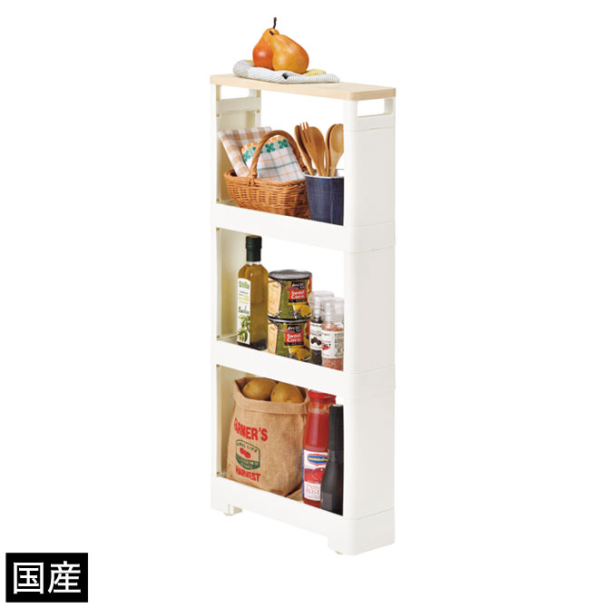 インフォメーション・注意事項 配 送 ※ 玄関先までのお届けとなります。 関連商品 シリーズ一覧 【リセ 収納シリーズ】 テーブルワゴン 3段 モバイルワゴン 3段 スーパースリムラック 4段 スーパースリムラック マルチ 4段 スーパースリムラック ウッド 4段 スーパースリムラック ウッドマルチ 4段 詳細・スペック 商品説明 マルチサイズの木製天板。 いろいろ使える超スリム幅。高さ85cmでシステムキッチンと同じ高さのスリムラック。(システムキッチン標準サイズの高さ85cmの場合) コロ付きで移動ラクラク。 サイズ(約) 本体:幅12×奥行40×高さ85cm 内寸(上段・中段):幅35×奥行10×高さ17.5cm (下段):幅35×奥行10×高さ31cm 重量:1.8kg 材 質 本体:ポリプロピレン、天板:木目調化粧繊維合板 耐荷重(約) 天板5kg、棚板上段・中段2kg、下段5kg 組立 お客様組立品(大人1名15分) 生産国 日本 その他・注意事項 コロ付 梱包サイズ:13×41×30cm(2.3kg)マルチサイズの木製天板。 いろいろ使える超スリム幅。高さ85cmでシステムキッチンと同じ高さのスリムラック。(システムキッチン標準サイズの高さ85cmの場合) コロ付きで移動ラクラク。 SIZE 関連商品 【リセ 収納シリーズ】 テーブルワゴン 3段 スーパースリムラック 4段 スーパースリムラック ウッド 4段 モバイルワゴン 3段 スーパースリムラック マルチ 4段 スーパースリムラック ウッドマルチ 4段