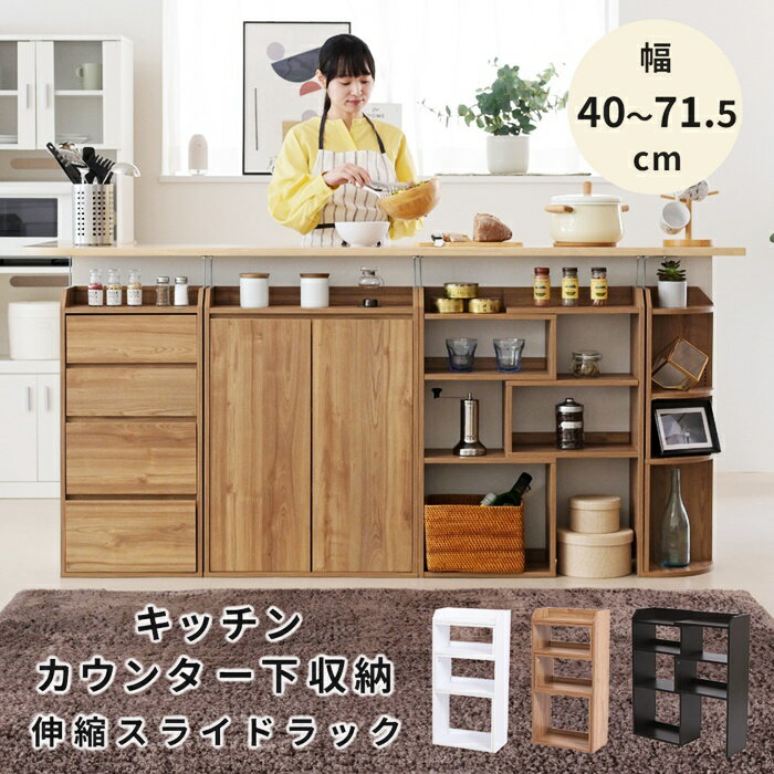 ■商品説明 お好みの幅に伸縮可能なラック。カウンター下使用時には、高さに合わせて2種類の突っ張り棒が付属されているのでしっかり固定可能で薄型でも前倒れの心配もありません。■本体サイズ[外寸] 幅40〜71.5×奥行22×高さ80cm (金具小使用時)高さ82.5〜90cm (金具大使用時)高さ90〜97.5cm■その他サイズ[内寸] (上オープン部左)幅0〜31×奥行20×高さ6.5cm (上オープン部右)幅36.5×奥行18.5×高さ5cm (2段目左)幅35×奥行20×高さ15cm (2段目右)幅0〜31.5×奥行21.5×高さ18.5cm (3段目左)幅0〜31.5×奥行21.5×高さ21.5cm (3段目右)幅35.0×奥行20.0×高さ18.5cm (4段目左)幅35.0×奥行19×高さ30cm (4段目右)幅0〜31.5×奥行21.0×高さ33cm■材質[本体]低圧メラミン化粧繊維板■収納量・耐荷重[最大伸長時]棚1枚約7kg以下 [無伸長時]棚1枚約15kg以下■備考・突っ張り金具2種類付属 ・幅木避け付き ・背面化粧あり■生産国中国■組立時間(目安)(大人2人)お客様組立(30分)■キーワード収納家具 キッチン収納 カウンター下収納庫 キッチンカウンター下収納 収納棚 キッチン下収納棚 カウンターキッチン下収納 腰窓下 リビング収納 ■送料 送料無料 沖縄・離島を含む(一部配送不可地域)のご注文は配達不可のためキャンセルさせて頂きます。