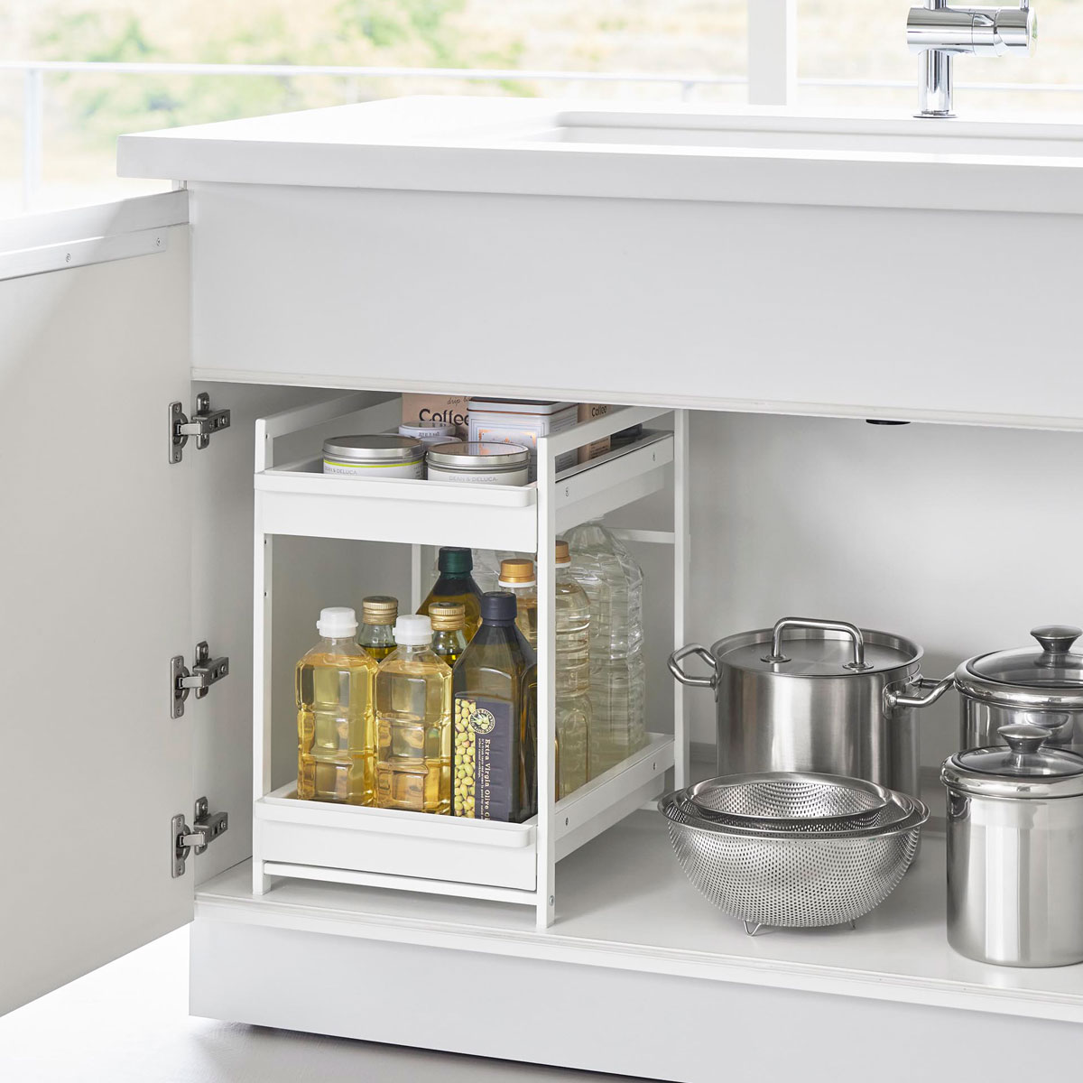 ▼ インテリアショップ roomy ( ルーミー )からのコメント ■ tower 伸縮シンク下ラック 2段 D40 キッチンや洗面台のシンク下スペースを有効活用できる伸縮ラック 『 tower( タワー )伸縮シンク下ラック 2段 D40 』。置く場所の広さに合わせて横幅が自在に変えられ、排水ホースを避けて置けるのでムダなく収納スペースが確保できる整理棚です。フライパンや鍋といった調理器具などの片づけたい物の高さに合わせて棚の高さを5.5cm刻みで調節できるのも嬉しいポイント。丈夫なスチール製で安定感のあるフリーラックです。“ヤマジツ”の愛称で親しまれる山崎実業は、「くらしを整える」商品を提案し続けています。 利用場所:キッチン 台所 コンロ下 ガスコンロ下 IHコンロ シンク下 食器棚 棚下 収納ラック シンク回り シンク周り キッチン周り キッチン回り スチールラック キッチンボード キャビネット 洗面 洗面所下 サニタリー お風呂 脱衣所 脱衣室 ランドリー ランドリールーム 棚の中 棚のなか 利用方法:シンク下ラック シンク奥ラック シンクラック コンロ下ラック ラック 鍋 フライパン 鍋蓋 フタ ふた ナベ ざる ボウル キッチン雑貨収納 雑貨収納 キッチンアイテム収納 収納アイテム 収納グッズ 収納用品 キッチンアイテム キッチン用品 キッチングッズ キッチン収納 キッチンツール収納 調理道具収納 キッチン道具収納 収納雑貨 台所用品 掃除道具収納 掃除アイテム収納 詰め替え洗剤 詰替え洗剤 ストック収納 洗面用具収納 洗面用具 洗剤 洗濯用品 シャンプー リンス トリートメント ヘアワックス ワックス スプレー ヘアケア用品 便利グッズ 便利アイテム 収納アイデア 片付け 整理 整頓 組み立て式 組立式 用途:キッチン下 キッチン下収納 台所下 台所下収納 コンロ下収納 ガスコンロ下収納 コンロ奥収納 洗面下収納 洗面カウンター下収納 隙間収納 フライパン収納 鍋収納 なべ収納 ナベ収納 食材収納 ストック収納 定位置 隙間収納 収納力アップ 収納量アップ スペース有効活用 スペース活用 省スペース デッドスペース活用 特徴:伸縮 サイズ調整 サイズ調節 幅調整 幅調節 高さ調節 高さ調整 2段 好みのサイズ フィット シンデレラフィット ジャストフィット 幅を変えられる 幅に合わせて 排水管 排水ホース すっきり コンパクト シンプル スタイリッシュ サッと スマート モダン 白 黒 しろ くろ ホワイト ブラック モノトーン ものとーん スチール 金属製 オシャレ お洒落 50cm〜85cm 50センチ〜85センチ 50cm 80cm 50センチ幅 50cm幅 80cm幅 80センチ幅 高さ35cm 高さ35センチ 奥行40cm 奥行40センチ 奥行き40cm 奥行き40センチ おすすめ:新生活 新生活準備 新居 引っ越し 引っ越し準備 新築 一戸建て 一軒家 賃貸 マンション アパート 一人暮らし 1人暮らし ひとり暮らし 二人暮らし 2人暮らし ふたり暮らし ファミリー ブランド:山崎実業 公式 オンラインショップ yamazaki やまざき ヤマジツ やまじつ tower タワー たわー towerシリーズ タワーシリーズ やまざきじつぎょう towerシリーズだけでカタログギフトができるぐらい商品数の多いタワー。商品の内容は本ページをご確認ください。 tower(タワー)について 1971年に奈良県生駒郡で創業した、インテリア雑貨メーカー「山崎実業」。“ワクワクする心に従い行動する”という理念のもと毎日の暮らしが便利で快適になるアイデアを生み出し、シンプルかつ機能的なアイテムを次々と生み出しています。創業60年を超え、「ヤマジツ」の愛称で親しまれながらファンを増やし続けています。 様々なシリーズの中でも、圧倒的な商品数と高い知名度を誇る「towerシリーズ」。人気の秘密は、インテリアに溶け込むシンプル&モダンなデザインと、生活に寄り添う便利なアイデア商品。キッチン、リビング、バスルーム、玄関など、家中のアイテムをタワーシリーズで揃えたくなるような豊富な商品バリエーションです。tower / タワー 伸縮シンク下ラック 2段 D40 特典キャンペーン実施中 シンク下スペースをムダなく有効活用 キッチンや洗面台のシンク下が有効活用できる『 tower( タワー )伸縮シンク下ラック 2段 D40 』。置く場所の広さに合わせて横幅が自在に変えられ、排水ホースを避けて置けるのでムダなく収納スペースが確保できます。片づけたい物の高さに合わせて棚の高さを5.5cm刻みで調節できるのも嬉しいポイント。丈夫なスチール製で安定感のあるラックです。 場所に合わせてぴったり設置 設置したい場所に合わせて横幅を調節できます。棚は2段で収納力も抜群。排水ホースを避けて設置できるので、シンク下をくまなく収納スペースとして活用できます。 横幅と高さを調節できる 横幅は50cm〜85cmの間で自在に調節でき、棚の高さも5.5cm間隔で変更可能。棚板は8枚に分かれているので横幅に合わせて付け外しできます。 排水ホースを避けて設置 棚板を外せば、排水ホースを避けて設置できます。 かさばる調理器具の整理に 棚の高さを調節すれば、大きめの鍋を置くこともできます。2