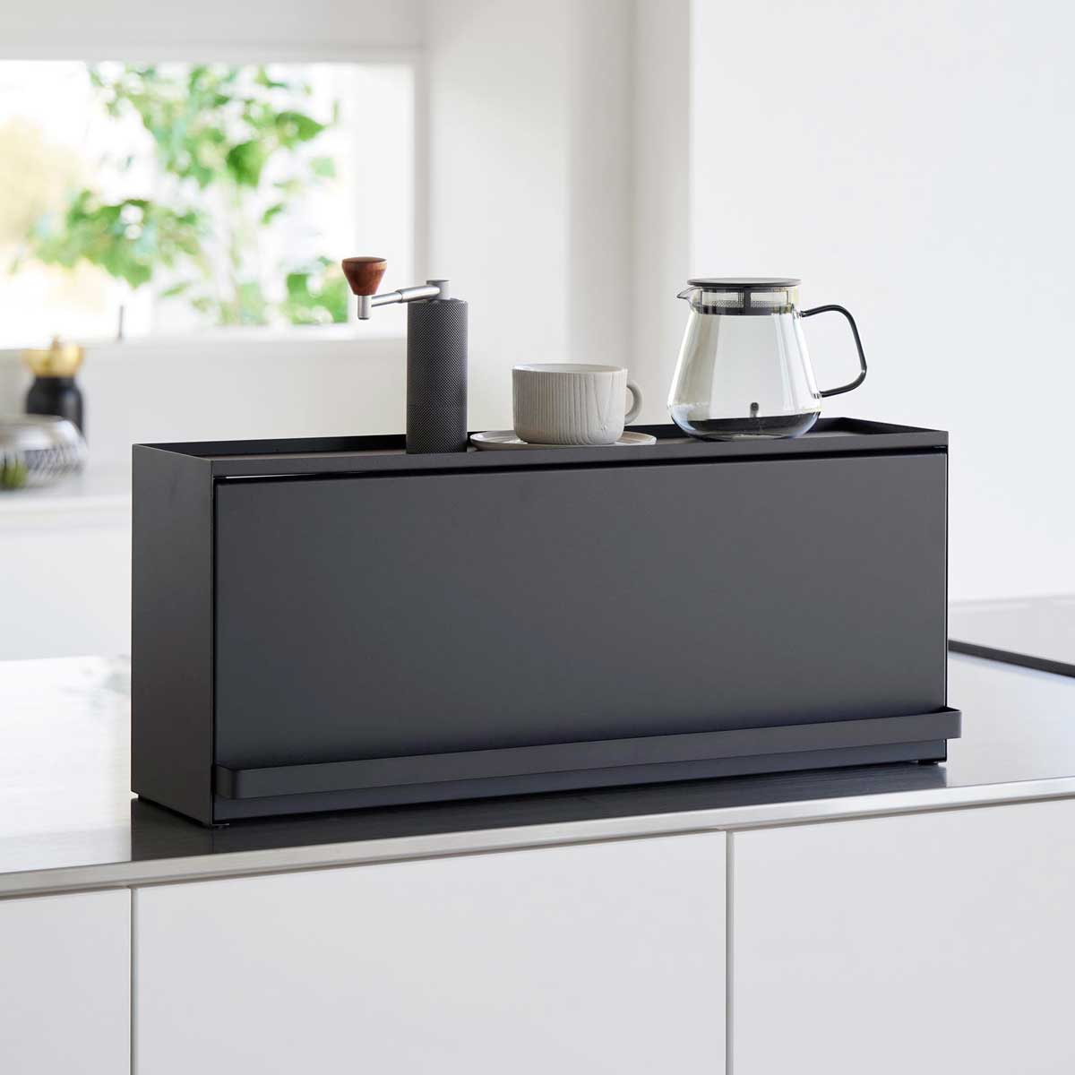キッチン側は扉なしで使いやすい リビングからはスッキリ隠せて、キッチンからは使い勝手の良さが嬉しい奥行き24cmのカウンター上収納ラックです。リビングからはスッキリ隠せて、キッチンからは使い勝手の良さが嬉しい。スチール製なのでマグネットがつき便利です。 天板にはトースターなどの家電も リビング側は全面が開くフラップ式の扉なので、中の物も取り出しやすいです。キッチン側は扉がないのでサッと物の出し入れがしやすいです。壁際に設置すればブレッドケースとしても使用でき、天板にはトースターを設置することができます。 商品の情報 ・ブランド:YAMAZAKI(山崎実業)/日本 ・ジャンル:カウンター上収納 ・主な素材:スチール 粉体塗装(本体)/POM樹脂(ローラー部)/ポリプロピレン(レール部)/シリコーン(クッション) ・生産国:中国 ・サイズ:約W600xD267xH252mm(扉を閉じた状態)/約W600xD310xH265mm(扉を開けた状態) ・内寸サイズ:約W597xD237xH10mm(天板)/約W597xD235xH210mm(収納部有効内寸 ※ローラー部含まず) ・重量:約5750g ・耐荷重:天板5kg、収納部5kg(静止荷重) この商品の仲間たち tower タワー 前が開くキッチンカウンター上収納ラック D24 1454 ホワイト tower タワー 前が開くキッチンカウンター上収納ラック D24 1455 ブラック