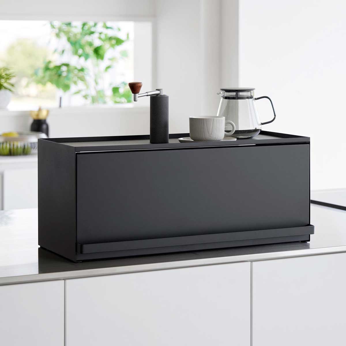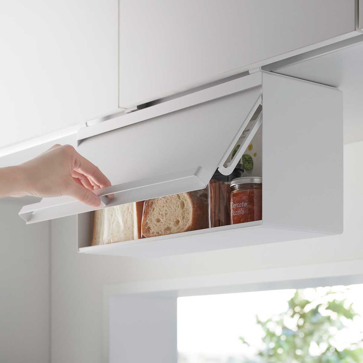戸棚下に浮かせて収納 キッチンの吊り戸棚に差し込むだけで簡単に設置できる、スチール製のブレッドケースです。パンや調味料をすっきり収納でき、キッチン周りを広く使えます。扉を開けるときは持ち上げてから押し込む構造です。 商品の情報 ・ブランド:YAMAZAKI(山崎実業)/日本 ・ジャンル:ブレッドケース ・主な素材:スチール 粉体塗装/POM樹脂(ローラー部)/シリコーンゴム(緩衝材) ・生産国:中国 ・サイズ:約W420xD170xH228mm/約D189mm(扉開口時) ・内寸サイズ:約W418xD146xH175mm(収納部有効内寸 ローラー部含まず) ・重量:約2540g ・耐荷重:4kg(静止荷重) ・取り付け可能な吊り戸棚:棚板の厚さ14-20mm、棚板の幅420mm以上、棚板の奥行き150mm以上、扉と棚板との隙間3.5mm以上が必要です。 ※設置場所のサイズや厚さ、形状、材質によっては設置できない場合があります。なお、ガラス戸へのご使用はお避け下さい。 この商品の仲間たち tower タワー 戸棚下ブレッドケース 10256 ホワイト tower タワー 戸棚下ブレッドケース 10257 ブラック