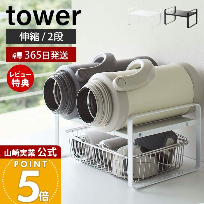 商品詳細 商品名 伸縮収納ラック 2段 タワー 品番 ホワイト:05399 ブラック:05400 JAN ホワイト:4903208053990 ブラック:4903208054003 素材 本体:スチール(粉体塗装) サイズ 本体:約幅27〜45×奥行20×高さ15.2cm 重量 本体:約1.3kg 内寸サイズ 上段:約幅24〜42×奥行20cm 上段天板からフレームまでの高さ:約4cm 下段:約幅24〜42×高さ10cm 天板サイズ 約幅42.5〜76×奥行37cm 耐荷重 約5kg 付属品 六角レンチ 備考 お客様組み立て品 ※個体差やロット・モニター環境等により、色味やサイズが若干表記と異なる場合がございます。伸縮自在!食器棚やキッチンカウンターで 用途に合わせて幅を調整できる上下2段使える便利で省スペースな収納棚。 置きたいものや場所によって幅を変えられる伸縮ラック 伸縮可能なので食器棚やパントリーの中のスペースを有効活用!幅は約27cmから最大45cmの間でサイズを変更できるので食器棚やキッチンカウンターなど空いているスペースに合わせて設置することができます。 上段・下段に分けて収納できます。下段は高さ10cmまでのトレイやバスケット、ワイヤーかごを使えば細かなキッチン小物類をまとめて収納すると便利です。 食器類やグラス、マグなどを上下2段に分けての収納がおすすめ! 天板の耐荷重は約5kgなので、電気ケトル、コーヒーメーカーなどの調理家電も収納できます。 置き場に悩む水筒をまとめて収納することもできます。2Lサイズのジャグボトルもすっきりと収納。下段には蓋などのパーツを置いておくこともできます。 左右のフレームは天板の位置よりも背が高いのでストッパー代わりになります。丸い水筒も転がり落ちる心配がないので安心して収納することができます。 サイズ 横幅 奥行き 高さ 約27〜45cm 約20cm 約15.2cm カラー ホワイト ブラック 商品詳細 商品名 伸縮収納ラック 2段 タワー 品番 ホワイト:05399 ブラック:05400 JAN ホワイト:4903208053990 ブラック:4903208054003 素材 本体:スチール(粉体塗装) サイズ 本体:約幅27〜45×奥行20×高さ15.2cm 重量 本体:約1.3kg 内寸サイズ 上段:約幅24〜42×奥行20cm 上段天板からフレームまでの高さ:約4v 下段:約幅24〜42×高さ10cm 天板サイズ 約幅42.5〜76×奥行37cm 耐荷重 約5kg 付属品 六角レンチ 備考 お客様組み立て品 ※個体差やロット・モニター環境等により、色味やサイズが若干表記と異なる場合がございます。 ご注文・配送についてのご注意必ずお読みください 返品・交換について必ずお読みください