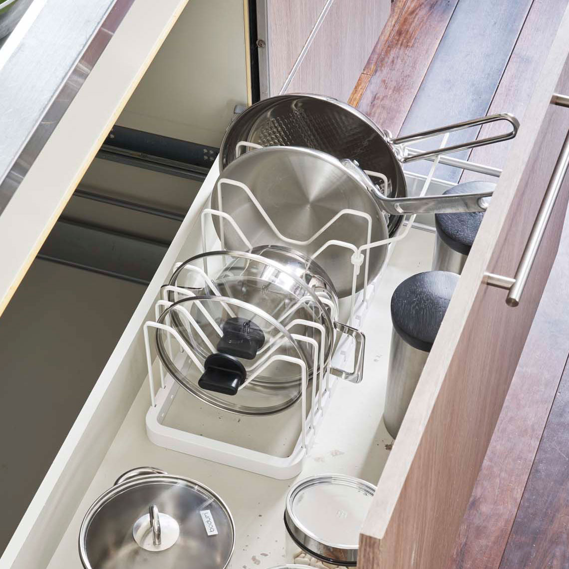 フライパンを立てて収納できる便利さ! シンク下のスペースにぴったりフィットする優れたアイテムです。伸縮機能により、シンク下の引き出しのスペースに合わせて調整できます。TOWERの製品なので、品質と信頼性は折り紙付きです。シンク下をスッキリと整頓して、使い勝手の良いキッチン環境を実現しましょう。 伸縮機能でシンク下スペースにフィット! フライパンを立てて収納できるため、取り出しもスムーズで、料理の効率もアップします。さらに、仕切りパーツの位置は3cmごとに調整可能なので、鍋やフライパンのサイズに合わせて自由に使い分けることができます。また、持ち手置き付きのデザインなので、フライパンを取り出しやすく、使い勝手も抜群です。 商品の情報 ・ブランド:YAMAZAKI(山崎実業)/日本 ・ジャンル:シンク下収納 ・主な素材:ABS樹脂(本体)/スチール 粉体塗装(仕切りパーツ)/シリコーン(ストッパー) ・生産国:中国 ・サイズ:約W450〜820xD200xH175mm(本体) ・内寸サイズ:1ピッチ約25mm(仕切りパーツを含まず)、2ピッチ目から約30mmごとに広がります。 ・重量:約940g ・対応サイズ:約180〜300mmまでの鍋、鍋蓋、フライパン ・内容物:本体 x1/仕切りパーツ x10/持ち手置き x1/ストッパー x2 ・その他:お客様組立て品となります。 この商品の仲間たち 正規品 TOWER タワー シンク下 伸縮鍋蓋&フライパンスタンド ホワイト 正規品 TOWER タワー シンク下 伸縮鍋蓋&フライパンスタンド ブラック