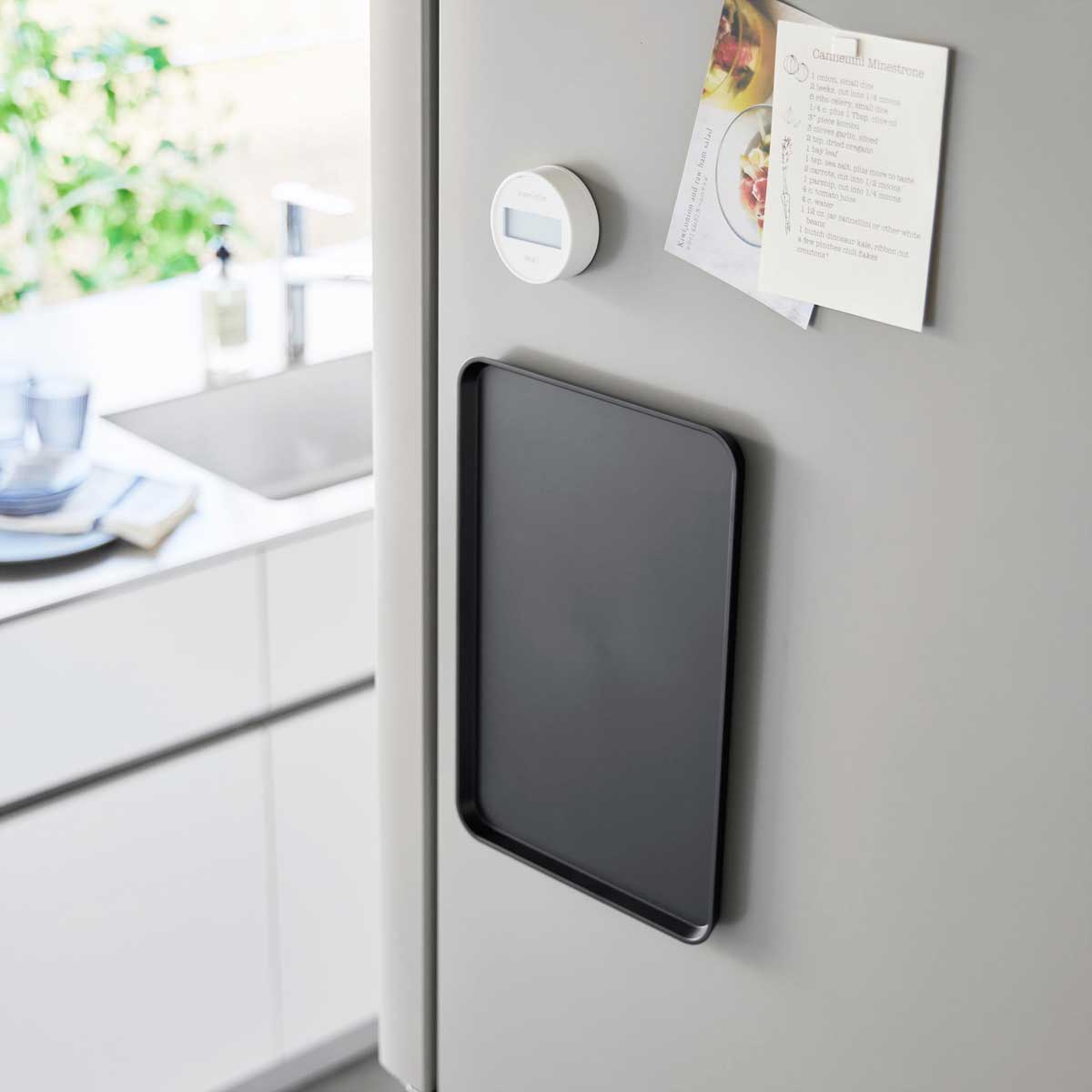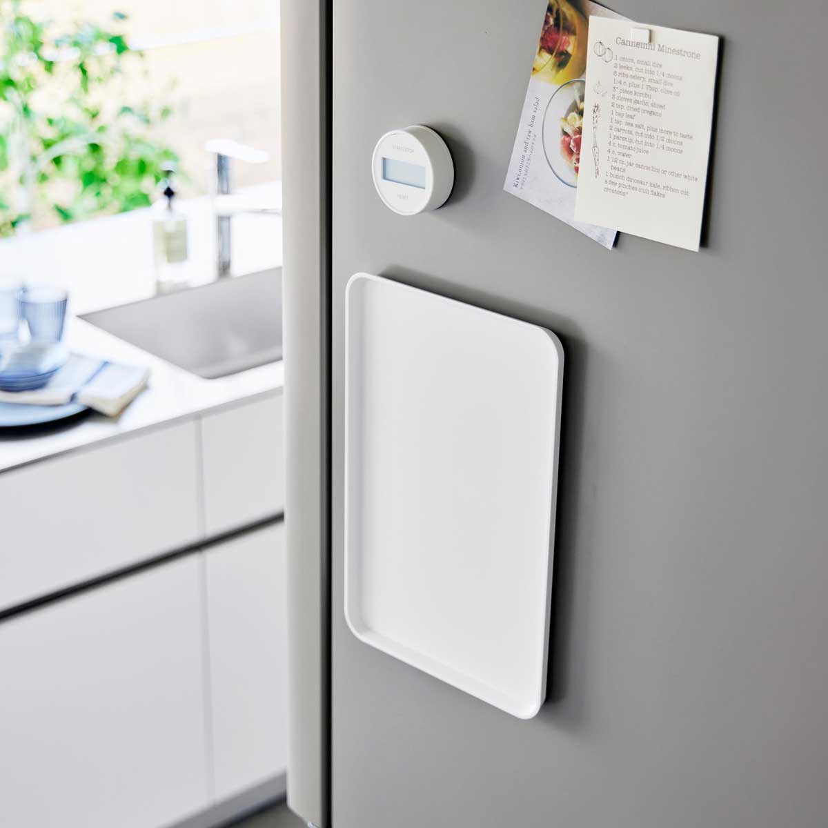使いたい時にサッと使える! マグネットで冷蔵庫横に収納できるトレーです。収納に困るトレーを冷蔵庫やキッチンパネル、ウォーターサーバー横にマグネットで簡単に取り付けて収納できます。使用したい時にサッと使えて便利。 収納に困るトレーを簡単収納! ティータイムにお茶やコーヒー、ケーキなどをのせたり、一人分の料理などを運ぶのにもちょうどいいサイズ。オフィスでは、お客様へのお茶出しにも活躍します。指を添えやすく持ちやすい構造で、使用後は簡単に収納できます。 商品の情報 ・ブランド:YAMAZAKI(山崎実業)/日本 ・ジャンル:トレー ・主な素材:ABS樹脂/マグネット ・生産国:中国 ・サイズ:約W315xD210xH17mm ・内寸サイズ:約W300xD195xH10mm ・重量:約270g ・耐熱温度:90℃ ・耐冷温度:-40℃ ・使える面:マグネットがつく平らな面 スチール面 この商品の仲間たち tower タワー マグネットトレー ホワイト tower タワー マグネットトレー ブラック