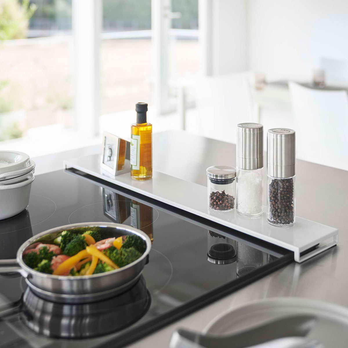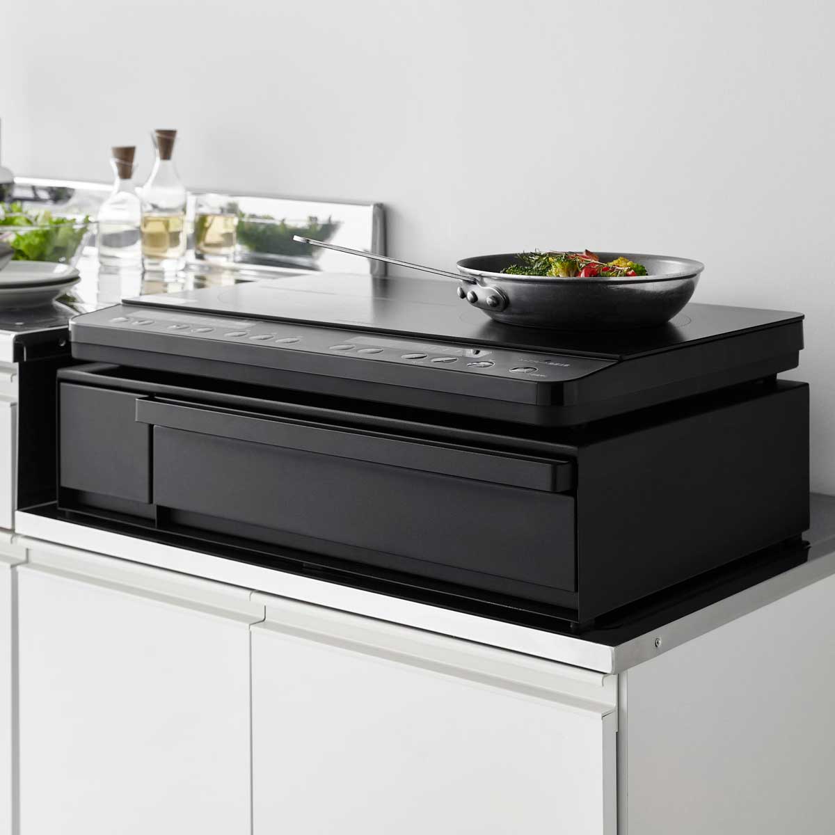 引き出しとスライドテーブル付き 大小の引き出しとスライドテーブルが付いたIHクッキングヒーターラック。収納と作業スペースが一つになった便利なラックです。電子レンジなど、家電周りでの使用もおすすめです。 収納と作業スペースがこれ一つに 引き出せるスライドテーブルはお皿や調理小物の一時置きなど調理中のサポートに。大きい引き出しは調理小物などの収納に、小さい引き出しには調味料などの収納におすすめです。 商品の情報 ・ブランド:YAMAZAKI(山崎実業)/日本 ・ジャンル:IHコンロ台 ・主な素材:スチール 粉体塗装(本体)/ポリプロピレン(レール部分)/シリコーン(クッション、ストッパー) ・生産国:中国 ・サイズ:約W574xD392-642xH135mm ・内寸サイズ:約W574xD370mm(天板)/約W445xD250mm(スライドテーブル)/約W433xD345xH90mm(引き出し大)/約D210mm(引き出し大 最大開口時)/約W109xD345xH115mm(引き出し小)/約D210mm(引き出し小 最大開口時) ・重量:約1050g ・耐荷重:20kg(天板)/各3kg(引き出し大、小、スライドテーブルの天板に2kg以上の物を置いた状態の静止荷重)※静止荷重 この商品の仲間たち tower タワー IHクッキングヒーターラック 引き出し&スライドテーブル 1293 ホワイト tower タワー IHクッキングヒーターラック 引き出し&スライドテーブル 1294 ブラック