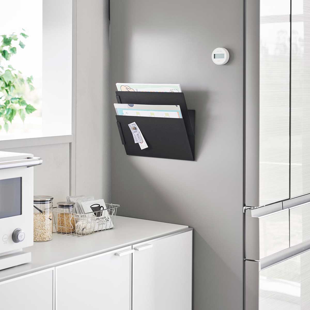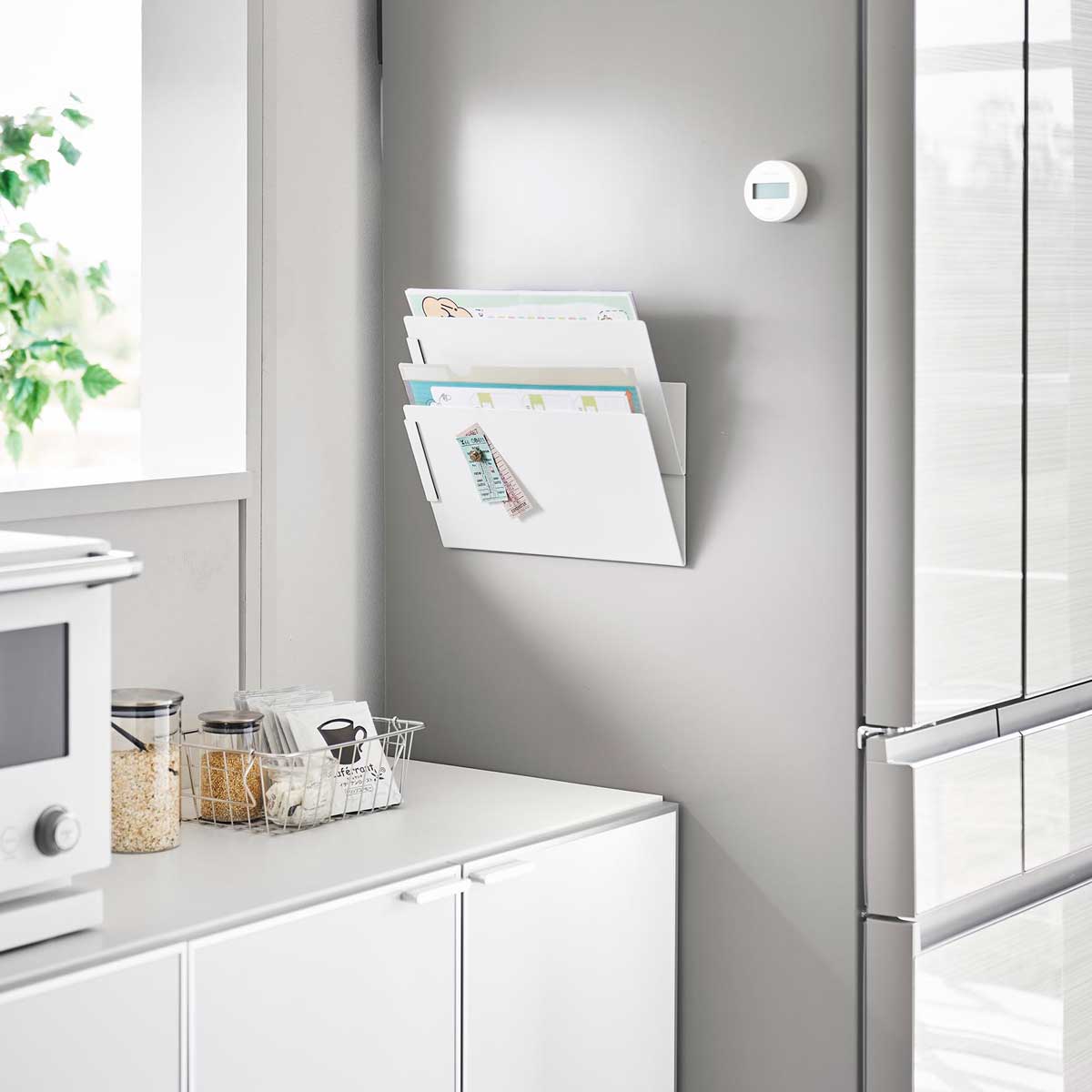 書類の滑り落ち防ぐストッパー付き 用途に合わせて縦横お好みの位置に連結させ、壁面空間を利用して収納を増やせるプリント収納ラック。冷蔵庫横などにマグネットで簡単取り付けできます。書類の滑り落ちを防ぐマグネットストッパー付き。 プリント類をすぐ手に取れる場所に 料理本やプリント類、キッチンアイテムや袋物アイテムなど、すぐ手にとれる場所に置くことができるので便利。マグネットが付くのでキッチンアイテムやレシート、プリント類を貼ることもできます。 商品の情報 ・ブランド:YAMAZAKI(山崎実業)/日本 ・ジャンル:プリント収納 ・主な素材:スチール 粉体塗装、マグネット(本体 x2、ストッパー x2)/シリコーンゴム(滑り止め) ・生産国:中国 ・サイズ:約W320xD80xH162mm(本体1つあたり)/約W320xH96mm(本体背面) ・重量:約1650g ・耐荷重:1kg(1つあたり 静止荷重) ・使用できる面;マグネットがつく平らな面、スチール面 この商品の仲間たち tower タワー マグネット縦横連結プリント収納ラック 2個組 1341 ホワイト tower タワー マグネット縦横連結プリント収納ラック 2個組 1342 ブラック