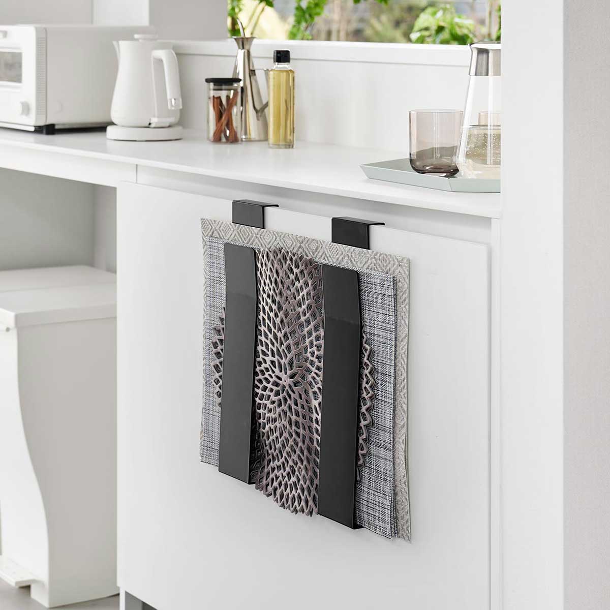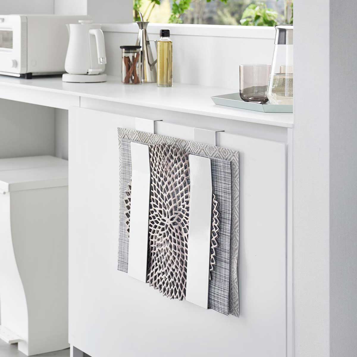 シンプル収納で快適なランチョンタイムを! 省スペースに収納できる「tower 扉に掛けるランチョンマット収納」は、サッと取り出せて便利なアイテムです。ランチョンマット収納はもちろん、厚さ約2.4cmまでのトレーも収納可能で、使い勝手も抜群。取り出しやすい形状と収納したいものに合わせて幅を調節できるので、よく使うゴミ袋やトレーを整理し、ランチョンタイムをスマートに演出します。 スタイリッシュデザインが暮らしを彩る! シンプルなデザインは、キッチンやダイニングをスタイリッシュに彩ります。扉の内側にも取り付け可能で、空間を有効活用。よく使うアイテムをスマートに収納し、暮らしの中に整理された美しさをもたらします。毎日の食卓がより一層楽しく、心地良い時間を演出するランチョンマット収納で、暮らしの質を向上させてみませんか。 商品の情報 ・ブランド:YAMAZAKI(山崎実業)/日本 ・ジャンル:ランチョンマット収納 ・主な素材:スチール 粉体塗装 ・生産国:中国 ・サイズ:約W80xD55xH390mm(本体1つあたり) ・重量:約770g(1つあたり) ・耐荷重:約3kg(1つあたり) ・対応サイズ:奥行約2.4cmまでのランチョンマット、トレー、ゴミ袋 ・取り付け可能な扉:本製品の幅約160mm以上(扉のハンドル等を含まない扉の幅)/約15〜24mmまで(扉の厚さ)/約3mm以上(扉と上部との隙間) ・注意事項:本製品は屋内の一般的な平面の流し台や洗面所などの扉を対象にしています。ガラス戸へのご使用はお避けください。 この商品の仲間たち 正規品 tower タワー 扉に掛けるランチョンマット収納 ホワイト 正規品 tower タワー 扉に掛けるランチョンマット収納 ブラック