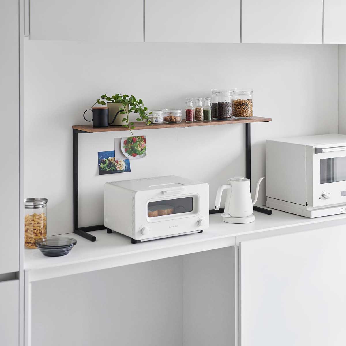 キッチン家電上を有効活用! 電子レンジなどのキッチン家電の上のスペースを有効活用できる棚です。フレームの存在感が少ないデザインで、キッチンに馴染みます。 ディスプレイしながら収納! 奥行きが18cmあるので、食器やキッチンツールをディスプレイしながら収納できます。耐荷重は7kgあり丈夫。置くだけの簡単設置、壁にネジを打ち込むことなく棚ができます。 商品の情報 ・ブランド:YAMAZAKI(山崎実業)/日本 ・ジャンル:キッチン収納 ・主な素材:スチール 粉体塗装(本体)/天然木化粧繊維板 ウレタン樹脂塗装(天板)/ポリプロピレン(キャップ) ・生産国:中国 ・サイズ:約W900xD183(ネジ含む)xH467mm ・内寸サイズ:約W900xD180mm(天板)/約W860xD166xH452(バー含まず)mm(天板下) ・重量:約3750g ・耐荷重:7kg ・付属品:六角レンチ ・その他:お客様組立て品となります。 この商品の仲間たち tower タワー キッチンカウンター上棚 ホワイト tower タワー キッチンカウンター上棚 ブラック