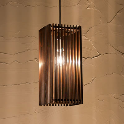 引掛シーリング取付式。吊高さ調節可能。光源寿命40000時間。 ランプ:LED電球4.2W(E17)・電球色2700K。材質:木製ウォールナット色塗装、鋼板黒塗装。サイズ:直径150×高さ155mmコード長600mm。重量:0.4Kg。固有エネルギー消費効率:81.0lm/W。定格光束:340lm。消費電力:4.2W。Ra82。 調光器との併用はできません。