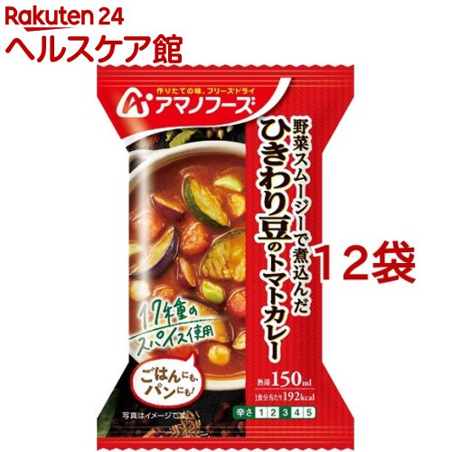 お店TOP>フード>加工食品・惣菜>フリーズドライ食品>フリーズドライ(スープ)>アマノフーズ ひきわり豆のトマトカレー (1食入*12袋セット)【アマノフーズ ひきわり豆のトマトカレーの商品詳細】●野菜スムージーで煮込んでつくりました。●17種類のスパイスを使い、コクやうまみを引き出した濃厚なカレーソースです。●具には3種類のひきわり豆を使い、豆それぞれの食感が楽しめます。【召し上がり方】・中身をうつわに入れ、熱湯を150ml注ぎ、とろみがでるまでよくかき混ぜてください。・お湯の注ぎすぎには、充分ご注意ください。【品名・名称】乾燥カレー【アマノフーズ ひきわり豆のトマトカレーの原材料】植物油脂(国内製造)、トマトペースト、グリルズッキーニ、ひよこまめ加工品、えだまめ、赤いんげんまめ、グリルトマト、揚げなす、チキンエキス、トマトケチャップ、カレールウ、野菜ペースト、カレー粉、ジンジャーペースト、ガーリックペースト、オニオンエキス、砂糖、クリーム、発酵調味料、しょうゆ、乾燥マッシュポテト、食塩、クミン末、酵母エキスパウダー、赤唐辛子末/増粘剤(加工デンプン、タマリンドガム)、調味料(アミノ酸等)、カラメル色素、酸化防止剤(ビタミンE)、香料、(一部に小麦・乳成分・大豆・鶏肉・豚肉を含む)【栄養成分】1食分(36g)当たりエネルギー:192kcal、たんぱく質:3.7g、脂質:13g、炭水化物:15g、食塩相当量:2.0g【アレルギー物質】小麦、乳、大豆、鶏肉、豚肉【保存方法】高温多湿の所を避け、常温で保存してください。【注意事項】本品製造工場ではえび・かに・卵を含む製品を生産しています。【ブランド】アマノフーズ【発売元、製造元、輸入元又は販売元】アサヒグループ食品※説明文は単品の内容です。商品に関するお電話でのお問合せは、下記までお願いいたします。菓子、食品、健康食品、サプリメント、スキンケアなど:0120-630611ミルク、ベビーフード、乳幼児用品専用:0120-889283リニューアルに伴い、パッケージ・内容等予告なく変更する場合がございます。予めご了承ください。・単品JAN:4971334210709アサヒグループ食品130-8602 東京都墨田区吾妻橋1-23-1 アサヒグループ本社ビル ※お問合せ番号は商品詳細参照広告文責:楽天グループ株式会社電話:050-5577-5043[スープ/ブランド:アマノフーズ/]