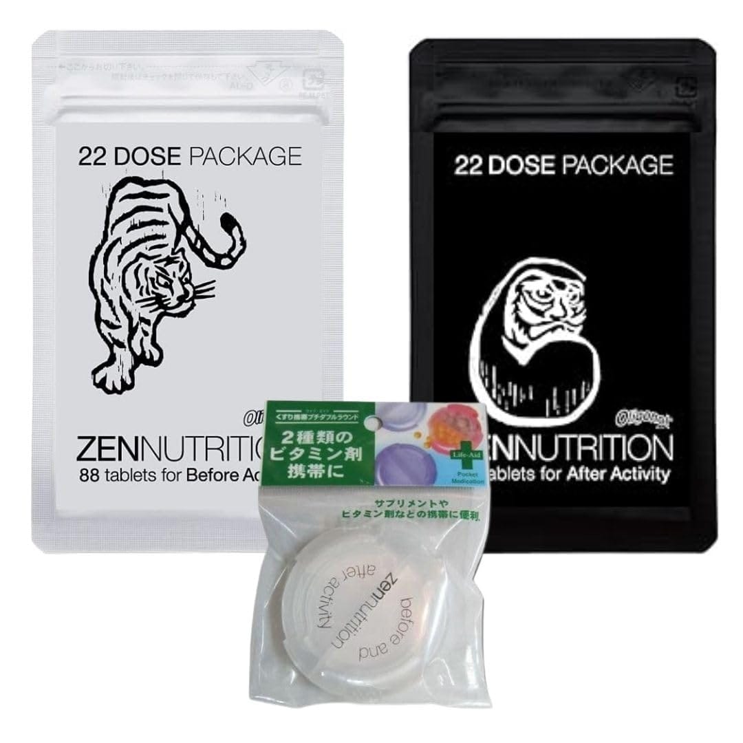「トラ(BEFORE)」と「ダルマ(AFTER)」の2種類のサプリメントセット内容量各88粒、合計176粒「トラ」は持久力向上、「ダルマ」は運動後のリカバリーをサポート天然由来の成分を使用し、携帯に便利なケース付きTRAUMオリジナルシール付 ZENニュートリション、「BEFORE(トラ)」と「AFTER (ダルマ)」の2種類をセットにてお届けします。 「BEFORE(トラ)」は、ロイヤルゼリー・蜂の子に加え、高速回遊魚カツオ抽出物(アンセリン)の持久系アミノ酸を配合。 さらに、これら天然由来のアミノ酸に運搬能力の優れた「オリゴノール潤・vを加えることにより、カラダの隅々までアミノ酸を届けます。 ZEN BEFORE ACTIVITY(トラ)運動前がおすすめ 「AFTER (ダルマ)」は、最適な栄養を素早く補給することが効果的なリカバリーとボディデザインに繋がります。持久系アミノ酸に代わり高品質な果糖を多く含むことによりBCAAを体に送り込みます。さらに「オリゴノール潤・vを加えることにより、スポーツの後に素早くリカバリー。運動直後の30分間は筋肉のゴールデンタイム。 ZEN AFTER ACTIVITY(ダルマ)運動後がおすすめ ■只今、AFTER (ダルマ)とAFTER (ダルマ)を分けて入れられ、携帯に便利なZenオリジナルケースプレゼント中です。