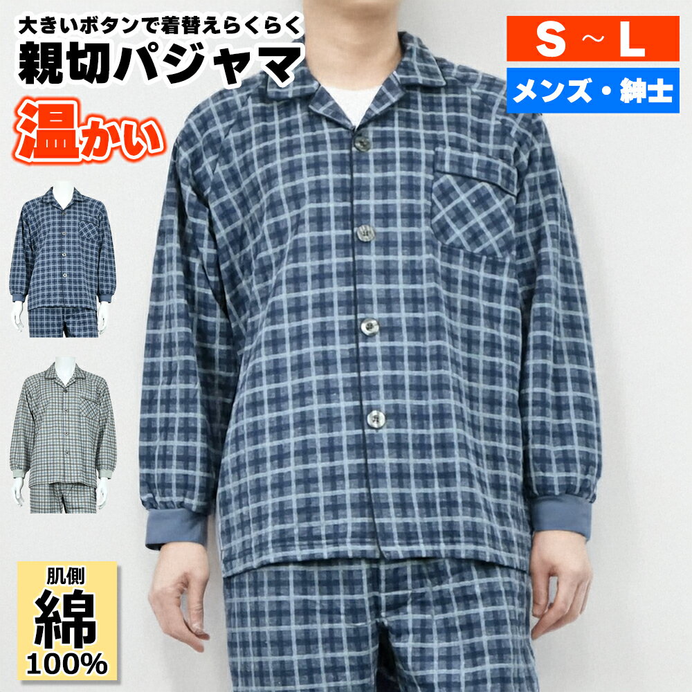 商品管理番号512535商品名紳士 長袖 中綿入り 裏綿100% キルト ラグラン 衿付 大釦 パジャマ 上下セット 親切パジャマサイズS 身丈:69cm 身巾:54cm 裄丈:80cm ウエスト:66〜73 総丈:97cm 股上丈:34cm 股下丈:63cm 裾幅:10cm M 身丈:71cm 身巾:56cm 裄丈:81cm ウエスト:70〜77cm 総丈:99cm 股上丈:35cm 股下丈:64cm 裾幅:10cm L 身丈:73cm 身巾:58cm 裄丈:82cm ウエスト:74〜81cm 総丈:101cm 股上丈:36cm 股下丈:65cm 裾幅:11cm素材本体:ポリエステル80%、綿20% 中綿:ポリエステル100% 袖リブ部:綿95%、ポリウレタン5%特徴親切パジャマ 高齢の男性にぴったりな秋冬向けのナイトウェア。 中綿入りであたたかく、裏地は綿100%だから肌にやさしく快適です。寒い季節の冷え対策に最適。ラグランスリーブ仕様で肩や腕が動かしやすく、寝返りや立ち座りもスムーズ。衿付きデザインが上品で、落ち着いた大人のスタイルを演出します。前開きの大きめボタンは、視力や手先の力が弱まった方でも扱いやすい親切設計。介護や入院時にも便利なユニバーサルデザインです。ゆったりとしたシルエットで締め付け感がなく、長時間の着用でも快適。ご自宅用はもちろん、お父さんやおじいちゃんへのプレゼント、敬老の日やお誕生日の贈り物にもおすすめです。 【大釦】ボタンを大きくする事で手の不自由な方でも着脱がらくらく。 【裾・手口ゴム】裾や手口にゴムを施すことで風の侵入を防ぎ、暖かさをキープしながら、袖や裾がまくれ上がりにくく快適な着心地を実現し、動きやすさとすっきりとしたシルエットを兼ね備えたデザインで、部屋着としても快適にご使用いただけます。 【前開き仕様】肩が上がらない人でも着やすい、着せやすい全開仕様。 【キルト】キルティングは、2枚の生地をステッチで押さえて作る為、様々な角度から負荷が掛かっても破れにくいのが特徴です。また中綿を入れて厚みを出す事でより耐久性が上がり、一枚の織り生地より断然へたりにくく長持ちします。中綿が断熱材となり、風を通さないので冬でも暖かいのが特徴です。滑りも良いので家着としても着やすい製品。 【ラグラン】肩の縫い目が襟元から袖にかけて斜めに配置されたデザインの袖を指します。このデザインにより、肩周りが動かしやすくなり、特にスポーツウェアやカジュアルウェアに多く使われています。 【ポリエステルと綿の混紡素材】肌触りの優しい綿とドライで爽やかなポリエステルとの混紡素材。綿素材の縮みやすく型崩れしやすいという短所をポリエステルがカバーするので、洗濯、乾燥がしやすいのが特徴です。 【ユニバーサルデザイン】加齢に伴う体型変化や身体能力の低下。それらのちょっとした困りごとを機能でサポートしながら、お洒落やお出掛けを楽しんで頂きたい。服を着る楽しみがなくなると、家を出るのが嫌になるもの。元気の出る明るい色を着れば、デイサービスや、老人ホームに行くのも楽しくなります。寝たきりの防止にも最適です。名札付きの衣料品は施設や入院、デイケアで活躍します。介護が必要なお客様の為に、介護者にとっても着せやすい工夫が凝らされており、病院でのリハビリ、通院が必要なお客様に便利です。 【ウォッシャブル素材】繊維の切れにくい丈夫な素材を使用しており、しわになりにくく、すぐ乾き、イージーケア。アイロン掛けも簡単です。安定性の高い素材ですので、デリケートな天然繊維100%の素材と違い、ご家庭の洗濯機で洗えるのが嬉しいポイント。一方で繊維が切れにくい素材は絡まった繊維が抜け落ちず、毛玉が目立ちやすくなる為、お洗濯の際には裏返してネットを使用するなどの注意が必要です。カラー杢ネイビー、杢グレー注意事項■素材の特性上、お洗濯やクリーニングにより多少の縮みやねじれが生じる場合もございます。 ■商品の撮影には最大限注意を払っておりますが、閲覧時のモニター環境によりましては実際の商品と若干違うお色味に映ることもございます。検索ワード40代 50代 60代 70代 80代 お誕生日 父の日 敬老の日 還暦 喜寿 傘寿 米寿 ギフト バレンタインデー クリスマス お祝い 贈り物 お得 安い シニアファッション ミドルファッション メンズ 秋 冬 あったか おじいちゃん お父さん 高齢者 祖父 衣類 紳士服 男性 ゆったり オシャレ ブランド ルームウェア ホームウェア ナイトウェア ユニバーサルデザイン 寝巻 寝間着 部屋着 プレゼント ネイビー グレー S M L 大釦 大きいボタン 全開 前開き 旅行 入院 施設 介護 小さいサイズ 特許 着脱しやすいCOLOR:杢ネイビーCOLOR:杢グレー ◆他のメンズ ナイトウェア アイテムはコチラ◆