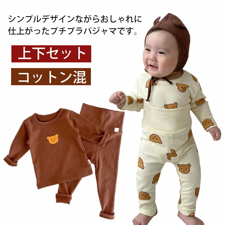 シンプルデザインながらおしゃれに仕上がったプチプラパジャマです。クマちゃんのプリントが可愛さ満点!選べる11柄展開、お着替えが楽しくなっちゃいますね。身生地は通年使えるやわらかな綿混素材で、一度着たら他のものが着たくなくなるほどの着心地の良さです。伸縮性が抜群で動きやすいので、日中のおうち時間も、夜のおやすみ中もパジャマとしてノンストレスで快適に過ごせます。色違いをご購入頂けると上下の組み合わせを入れ替えてオリジナルの配色をお楽しみいただくこともできます。 サイズ66 73 80 90 100サイズについての説明66:着丈28cm バスト48cm 袖丈24cm ズボン丈40cm/ 73:着丈30cm バスト50cm 袖丈25cm ズボン丈43.5cm/ 80:着丈32cm バスト52cm 袖丈26cm ズボン丈47cm/ 90:着丈34cm バスト56cm 袖丈28cm ズボン丈50.5cm/ 100:着丈36cm バスト60cm 袖丈30cm ズボン丈54cm/ ※サイズ表の実寸法は商品によって1-3cm程度の誤差がある場合がございます。素材コットン混色柄1 柄2 柄3 柄4 柄5 柄6 柄7 柄8 柄9 柄10 柄11備考 ●サイズ詳細等の測り方はスタッフ間で統一、徹底はしておりますが、実寸は商品によって若干の誤差(1cm〜3cm )がある場合がございますので、予めご了承ください。 ●商品の色は、撮影時の光や、お客様のモニターの色具合などにより、実際の商品と異なる場合がございます。あらかじめ、ご了承ください。●製品によっては、生地の特性上、洗濯時に縮む場合がございますので洗濯時はご注意下さいませ。▼色味の強い製品によっては他の衣類などに色移りする場合もございますので、速やかに(脱水、乾燥等)するようにお願いいたします。 ▼生地によっては摩擦や汗、雨などで濡れた時は、他の製品に移染する恐れがございますので、着用の際はご注意下さい。▼生地の特性上、やや匂いが強く感じられるものもございます。数日のご使用や陰干しなどで気になる匂いはほとんど感じられなくなります。