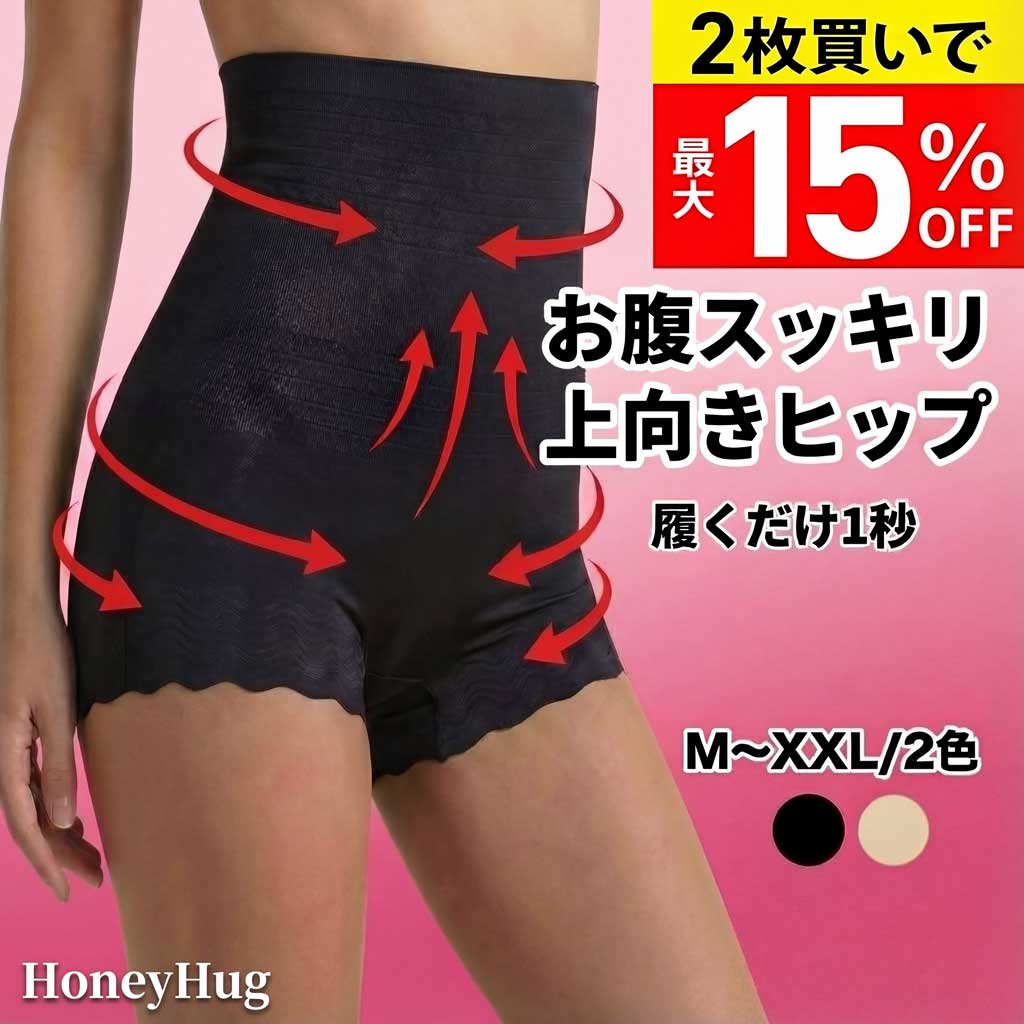 ガードル ぽっこりお腹対策 ハイウエスト補正ショーツ HoneyHug 履くだけで、ぽっこりお腹・腰まわり・ヒップラインをトータルケア。 HoneyHug 補正ショーツは、ハイウエスト設計のガードルタイプで、 お腹・骨盤まわりをしっかり支えながら、気になる下半身ラインをすっきりと整えます。 薄型で通気性のよい生地と、太ももに食い込みにくいローレッグフレア仕様だから、 長時間のデスクワークや家事、お出かけでもストレスフリー。 一枚ばきもできる補正下着として、産後の骨盤ケアや美くびれ・ヒップアップを目指す レディースの毎日使いにぴったりです。 HoneyHug 補正ショーツの特長 ハイウエスト設計でぽっこりお腹をしっかりシェイプ 骨盤サポート&姿勢補正を同時にサポート ヒップ下から持ち上げるパターンで自然なヒップアップを演出 ローレッグフレア仕様で太ももへの食い込みを軽減 薄型・通気性のよい生地で、アウターにひびきにくくオールシーズン快適 クロッチ部分は綿100%で一枚ばきOK M?XXLまでのサイズ展開で、大きいサイズにも対応 こんな方におすすめ ぽっこりお腹・腰まわり・下半身のラインが気になる方 産後の骨盤ケア用ガードル・補正ショーツをお探しの方 締め付けすぎないハイウエストガードルでスタイルアップしたい方 一枚ばきできる補正下着で、毎日手軽にボディメイクしたい方 通気性のよい薄型ガードルで、長時間のデスクワークや立ち仕事を快適に過ごしたい方 製品仕様 製品名 HoneyHug 補正ショーツ カラー ベージュ/ブラック サイズ Mサイズ:ウエスト 56〜62cm/ヒップ 70〜80cm Lサイズ:ウエスト 60〜66cm/ヒップ 74〜84cm XLサイズ:ウエスト 64〜70cm/ヒップ 78〜88cm XXLサイズ:ウエスト 68〜74cm/ヒップ 82〜92cm 材質 ウエスト:ナイロン 58%/ポリウレタン 42% ヒップ:ナイロン 69%/ポリウレタン 31% ローレッグ:ナイロン 80%/ポリウレタン 20% クロッチ:綿 100%ガードル ぽっこりお腹対策のハイウエスト補正ショーツ「HoneyHug」。 ぽっこりお腹・骨盤まわり・ヒップラインを一枚ではける補正下着でトータルサポートします。 薄手で通気性のよい生地と、太ももに食い込みにくいローレッグフレア仕様のレディース用ガードルだから、 長時間のデスクワークや家事、外出時もストレスフリーなはき心地を目指しました。 産後ケア用ガードルや、毎日のスタイルアップ・下半身ラインが気になる方の補正ショーツとしておすすめです。 ガードル ぽっこりお腹 ハイウエスト 補正ショーツ HoneyHug 骨盤ガードル 骨盤補正 補正下着 着圧ショーツ お腹引き締め 下腹補正 下半身補正 ヒップアップ 美尻 太もも引き締め ローレッグ フレア レディース 大きいサイズ 産後ガードル 産後ケア 姿勢補正 ウエストシェイプ 薄手 通気性 一枚ばき インナー シームレス ガードル 通販 楽天 人気 ランキング 40代 50代 ママ